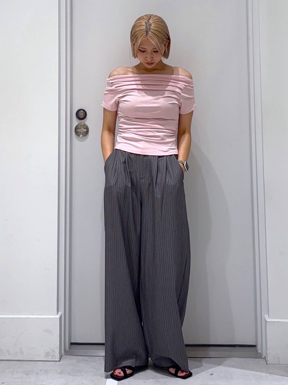 トップス👕 名前の通り華奢見えするシンプルトップス💞! オフショルにして着られる伸縮性!着心地も良く どんなアイテムとも相性抜群です! ボトムス👖 フロントに入ったタックが形を綺麗に見せてくれつつ ワイドでルーズ感のあるシルエットがかっちりしすぎず着られるスラックスです🎶🎶
