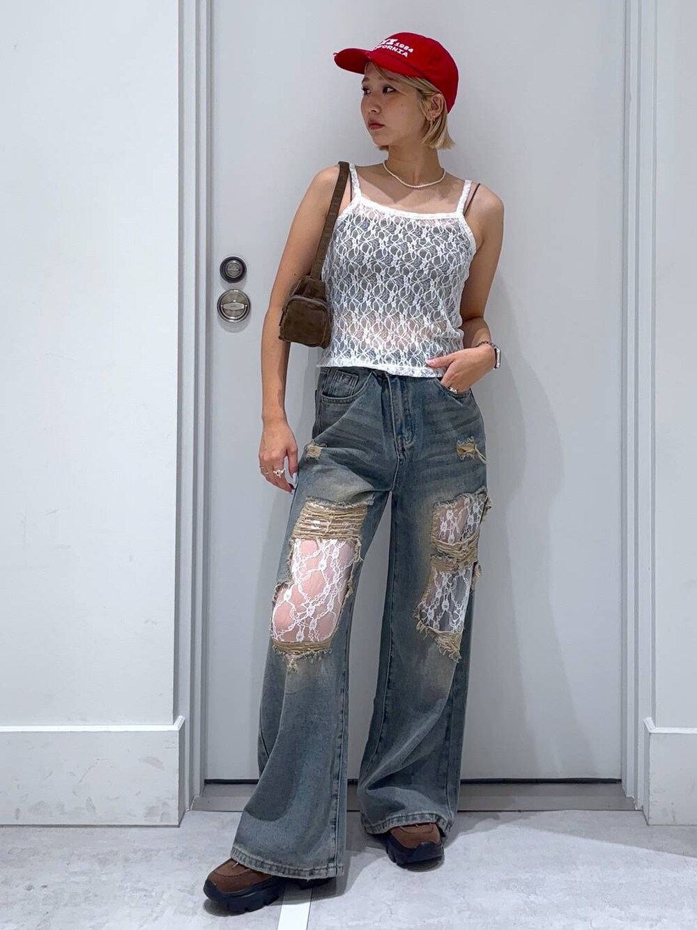 トップス👕 レース素材のキャミ🎀🎀 シンプルで使いやすくレイヤードもしやすいので 夏のプラス1におすすめのアイテムです☀️ ボトムス👖 ワイドシルエットでゆるっと着られるデニム♪ ダメージ加工×レースがトレンド感もあって 一枚で主役級のデニムです!