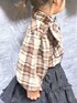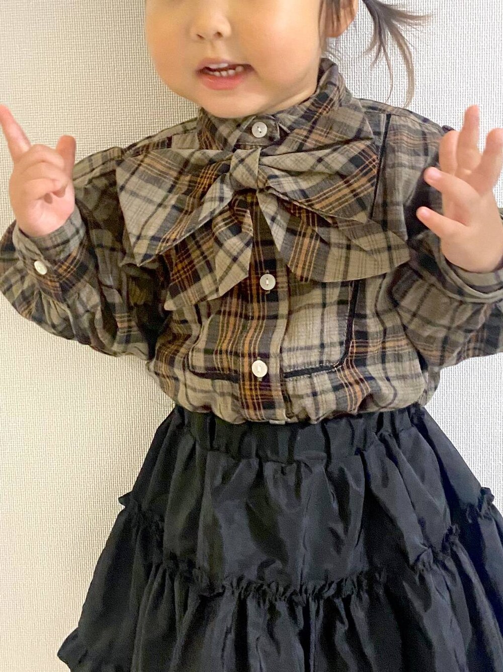 KIDSコーデ🤎 95cm 110size着用👧🏻 大きいリボンが可愛いこちらのブラウス🎀 リボンは取り外しが可能なので スタイルのお好みで活用していただけます! 付けていてもゴムがきつい感じなどは 一切ないので娘も嫌がったりせず付けてました! お袖がパフになっていてボリュームかわいいです♡ 袖丈もボタンで手首部分で止まるので 長すぎる感じなく着ることができました!