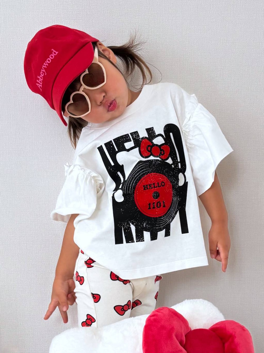 ┈┈┈┈┈┈┈┈┈┈┈┈┈ 3y5m 104cm ぽっこりお腹のむちっと体型👧🏻 ┈┈┈┈┈┈┈┈┈┈┈┈┈ ⭐各アイテムのおすすめポイント →ぜひ下の商品ページから飛んでごらんください!❤️🔥  ̄ ̄ ̄ ̄ ̄ ̄ ̄ ̄ ̄ ̄ ̄ ̄ ̄ ̄ ̄ ̄ ̄ 【トップス】 110size ハローキティコラボ! 今年はフリルTが出ました! デザインが可愛くて一枚で主役になってくれます🍎 サイズ感は110で少しゆったり 身幅があるので細身なサイクルパンツと相性◎