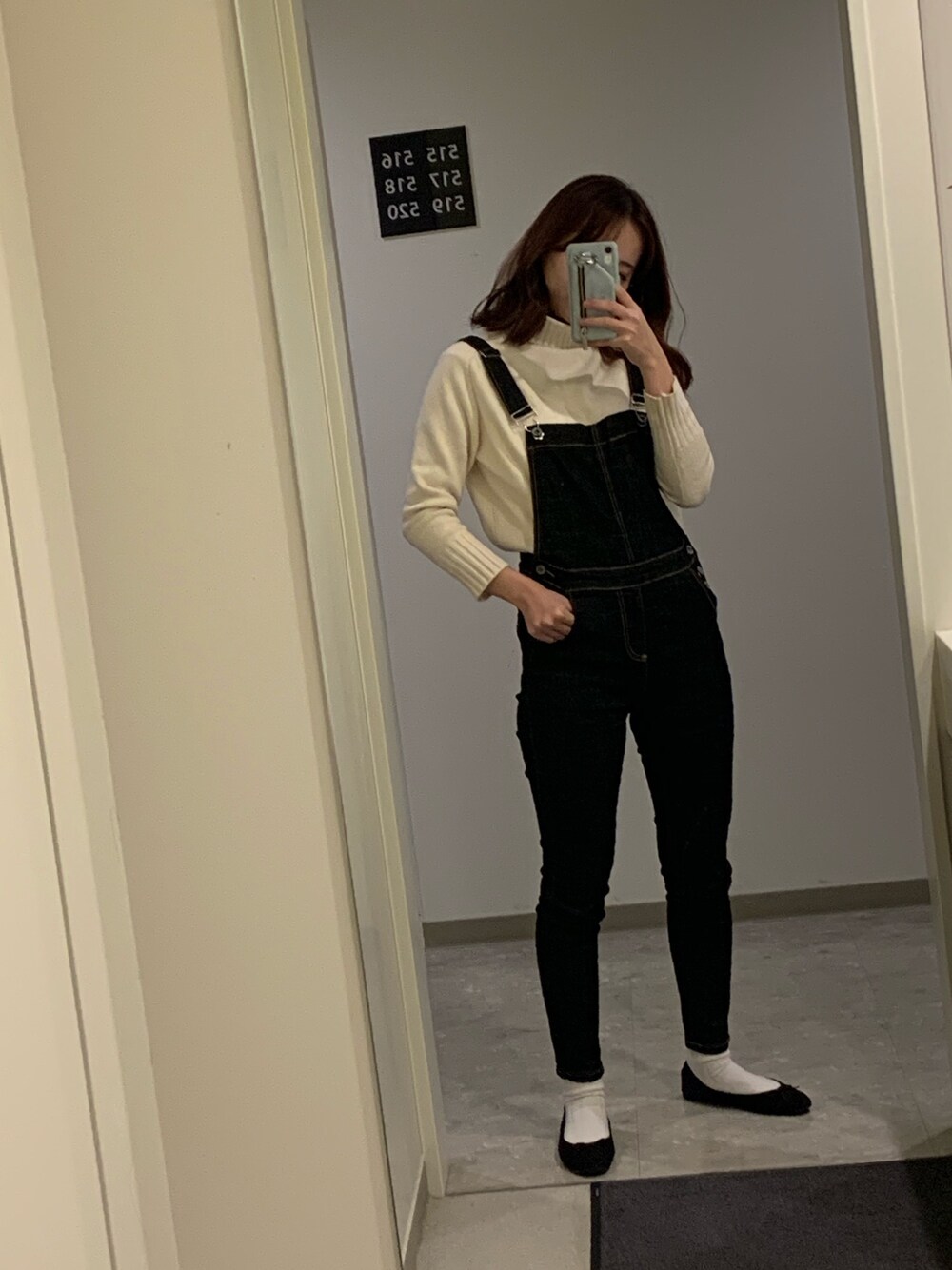 すっかりサロペットにハマってしまった! 袖が派手目のトップスもいいけど、タートルニットで冬モードなのも可愛いんだ〜。