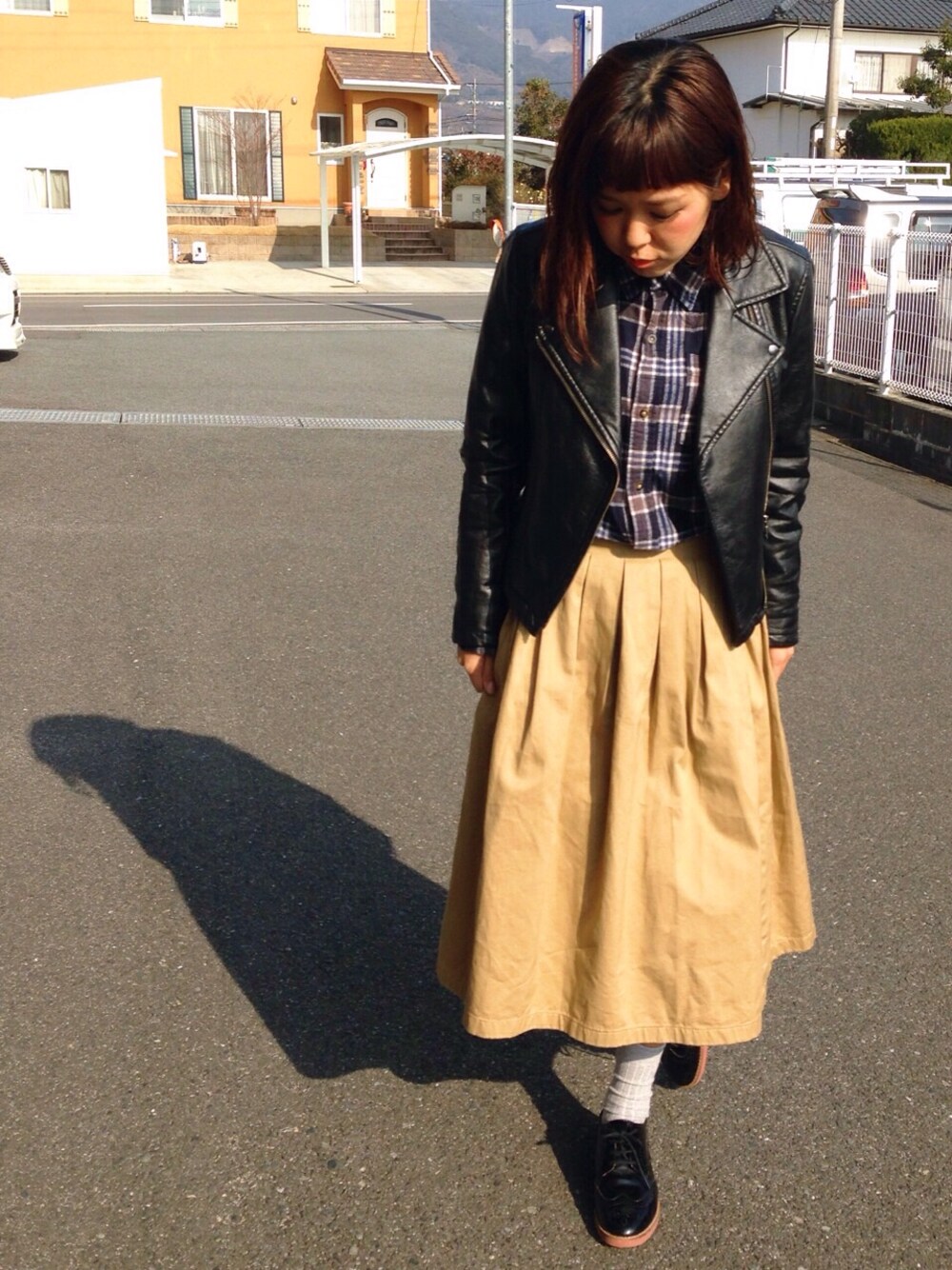 写り方で靴下がすごく長く見えてますw この長さのスカートはいいですね! 楽チン♩♩ チェックシャツはブルー×グレーのネルシャツです♡