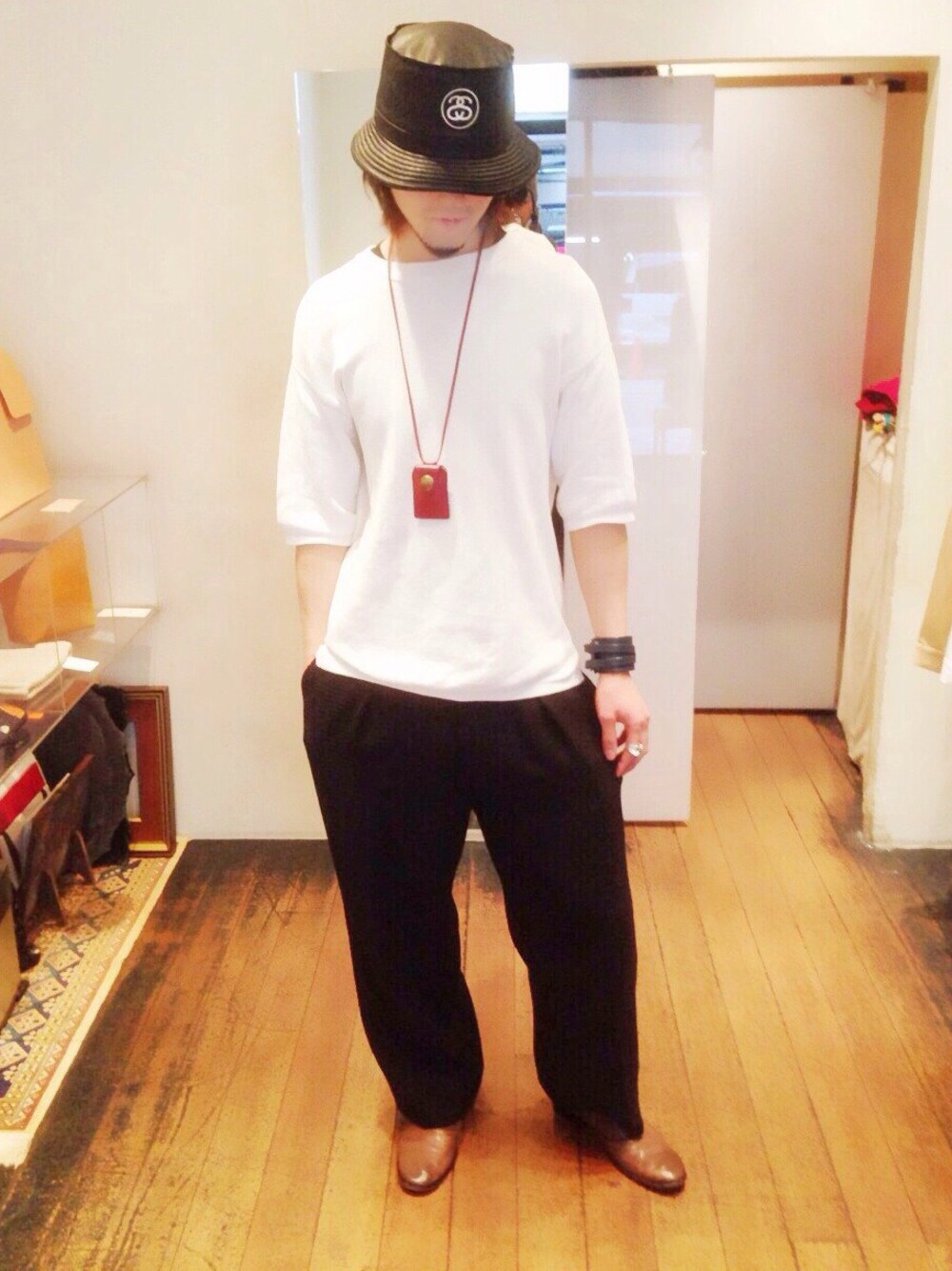 the sakaki × crepsculeのニットカットソー the sakakiのワイドパンツ stussyのレザーハット BLACK MEANSのお守りケース BLACK MEANSのレザーブレス Mのリング ILLEIの革靴