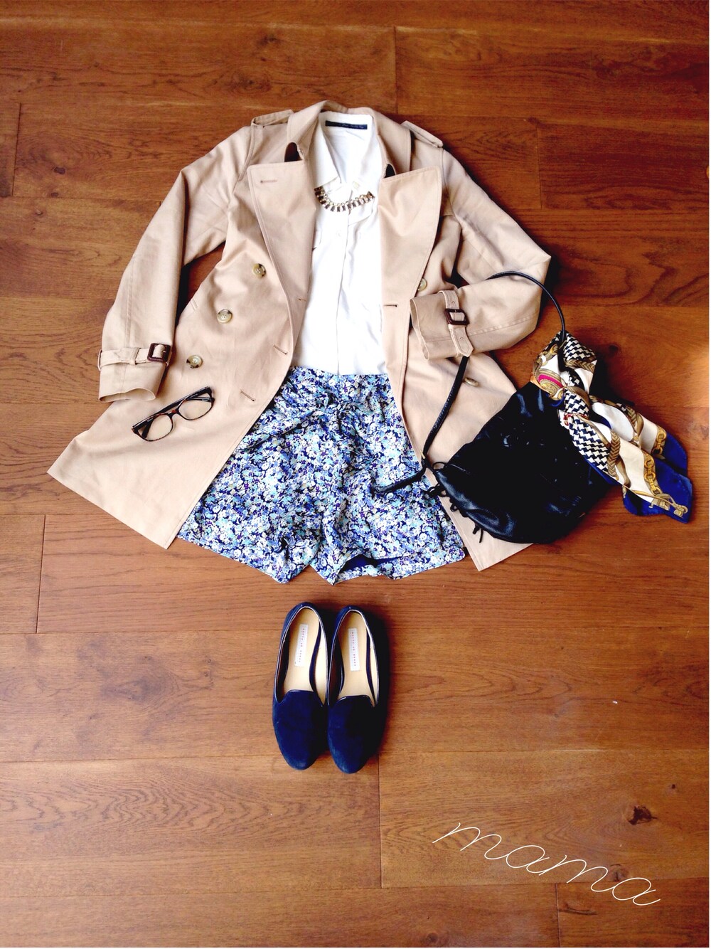 ブラウス Spick and Span 花柄ショートパンツ URBAN RESEARCH バッグ IENA SLOBE スカーフ IENA めがね JINS 靴 SENSE OF PLACE