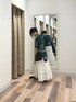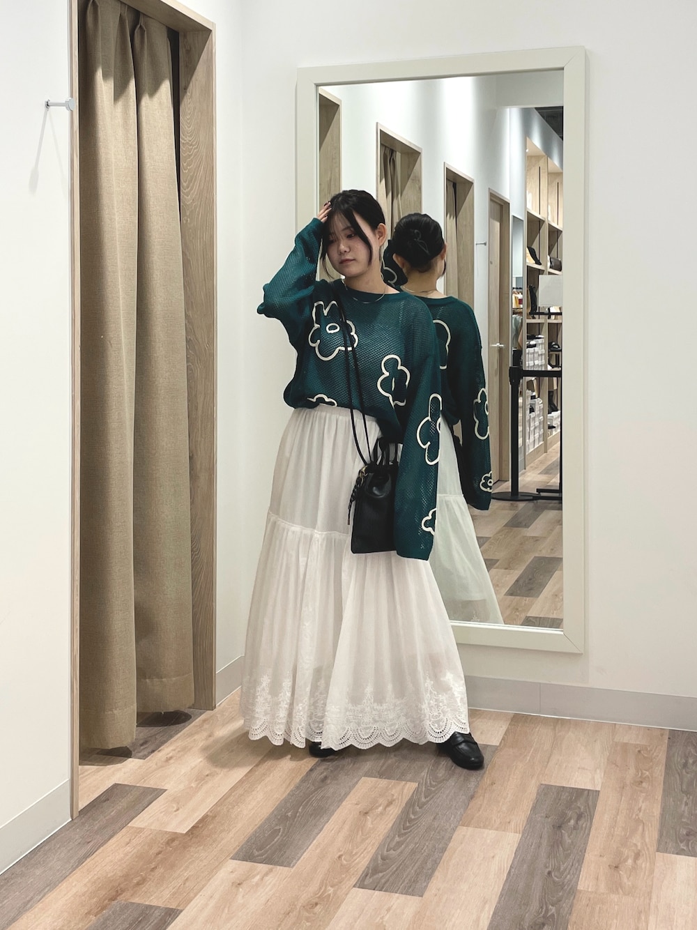 ジャストサイズだけど袖はゆったり丈感なグリーンのメッシュニット! 着心地もサラサラで不快感0! 刺繍の白をスカートと合わせて可愛らしい コーディネートに!