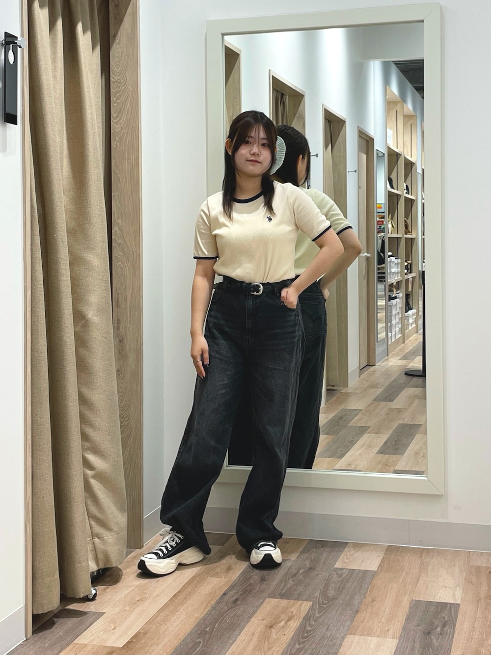 トップスが白で着膨れが気になる方はボトムスをハイウエスト、黒を選ぶと全体的にIラインが生まれてすっきり見えます!