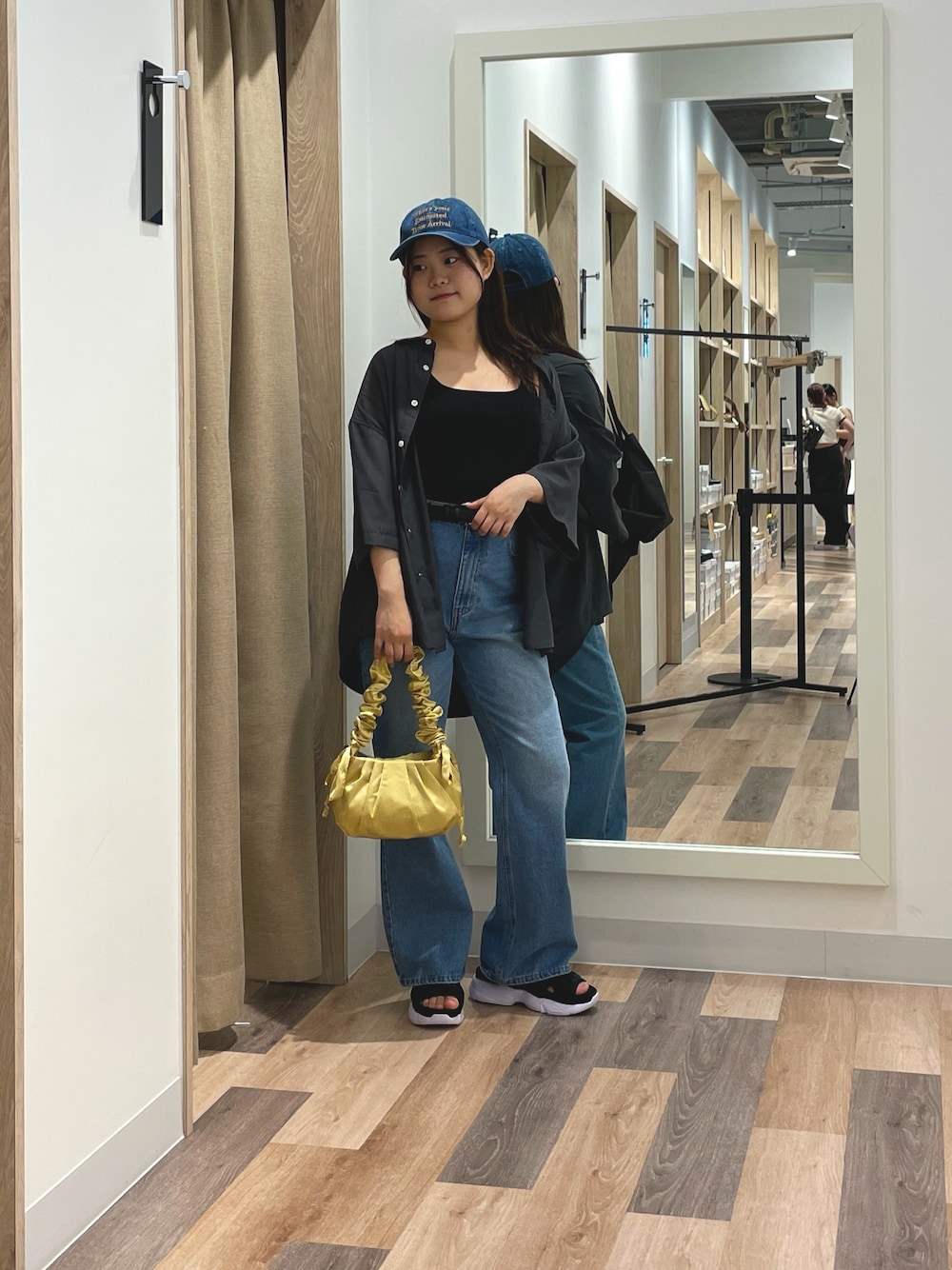 脚長効果抜群のフレアデニム! キャミソールにシャツを羽織ってウエスト位置を強調すればさらに脚長に!