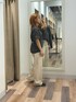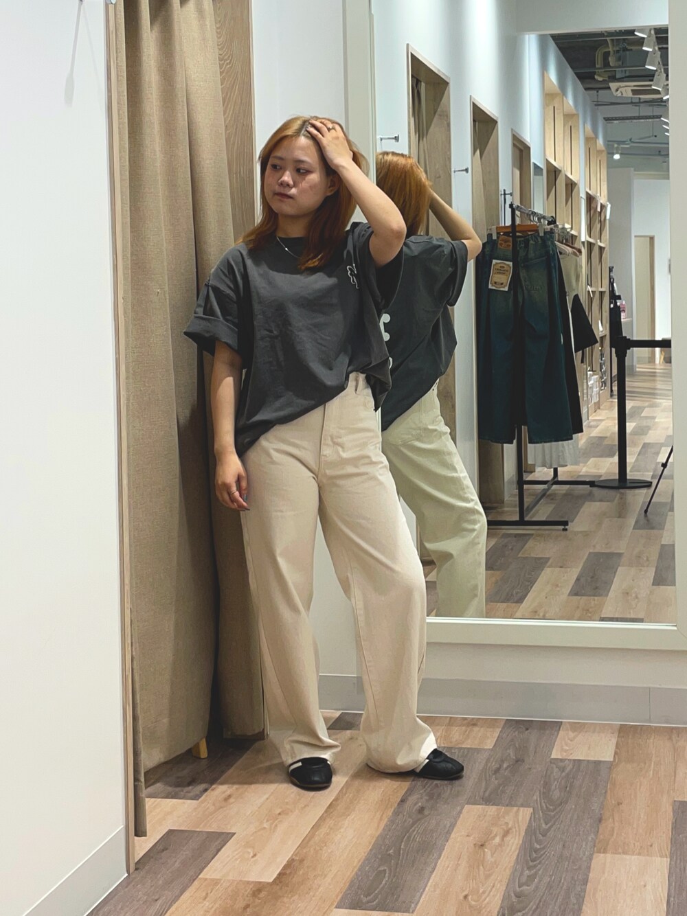 低身長さんはゆったりサイズは着られてる感がでやすいので少し裾をインすると脚長効果もあっておすすめ! デニムはXSサイズ着用で床に着くかつかないかギリギリなのでいつも履いているサイズよりワンサイズ下がおすすめ!