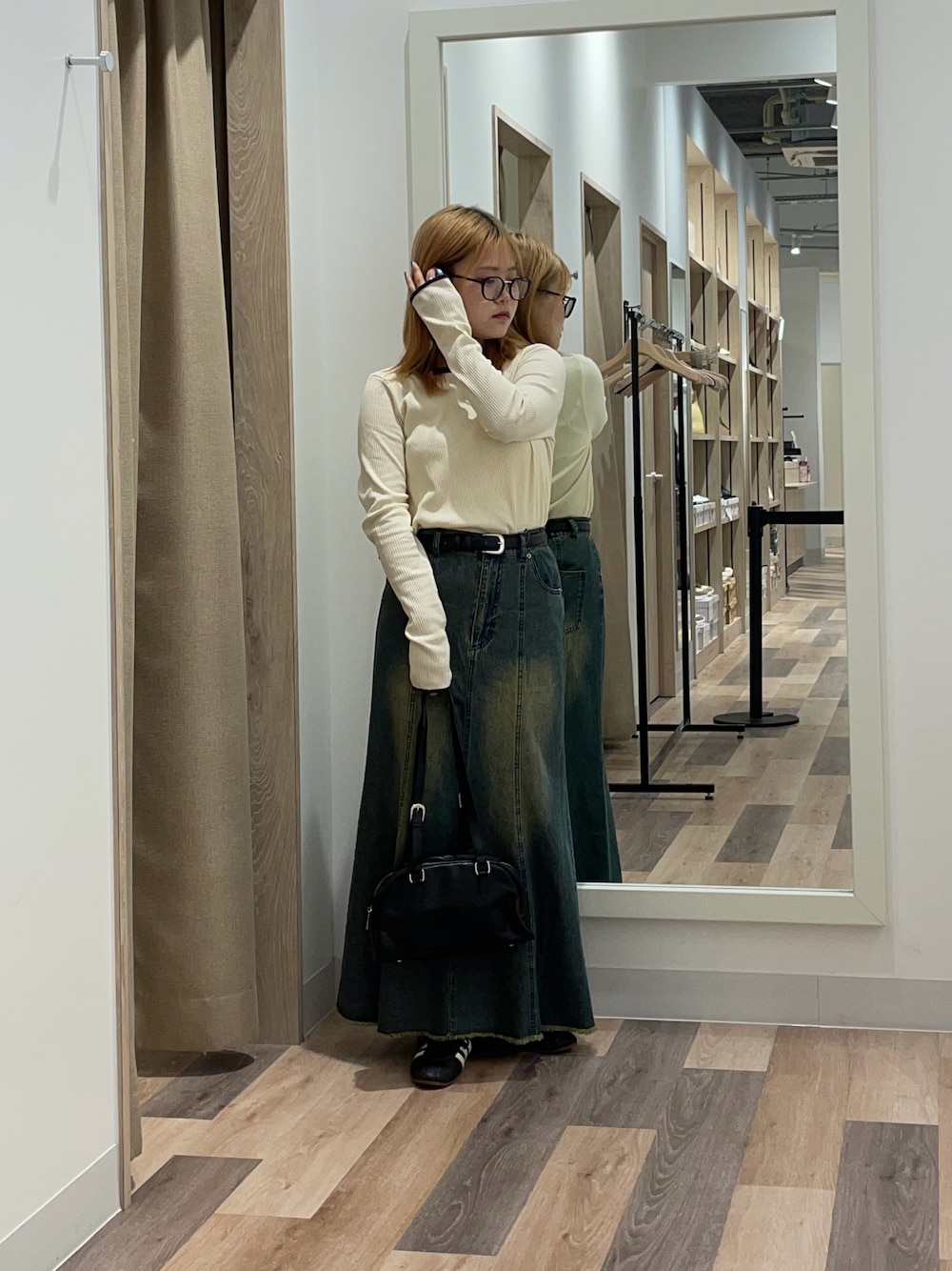ロンTはサムホールが空いていて腕が細く長く見えます! スカートはくるぶしくらいまでの丈感です!