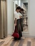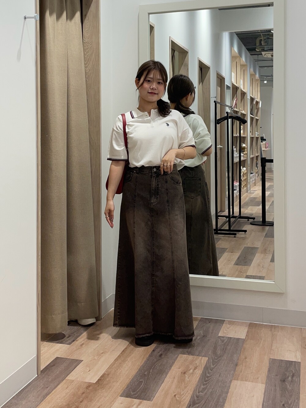 トップスはニット生地のポロシャツだから半袖だけど季節感が出て◎! スカートはくるぶしくらいまでの丈感なので低身長さんはPSサイズがおすすめです!