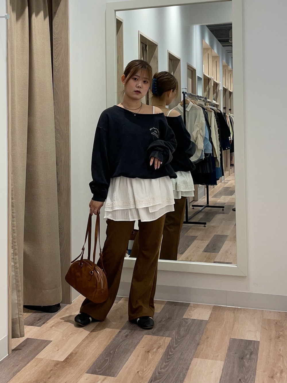 スウェットは首元が少し大きめデザインなので骨ストさんはワンショルにして着ると子供っぽくならずに着ることが出来ます! フレアパンツはすごく伸びるのに脚を細く見せてくれます!155cmでMサイズ着用してます!