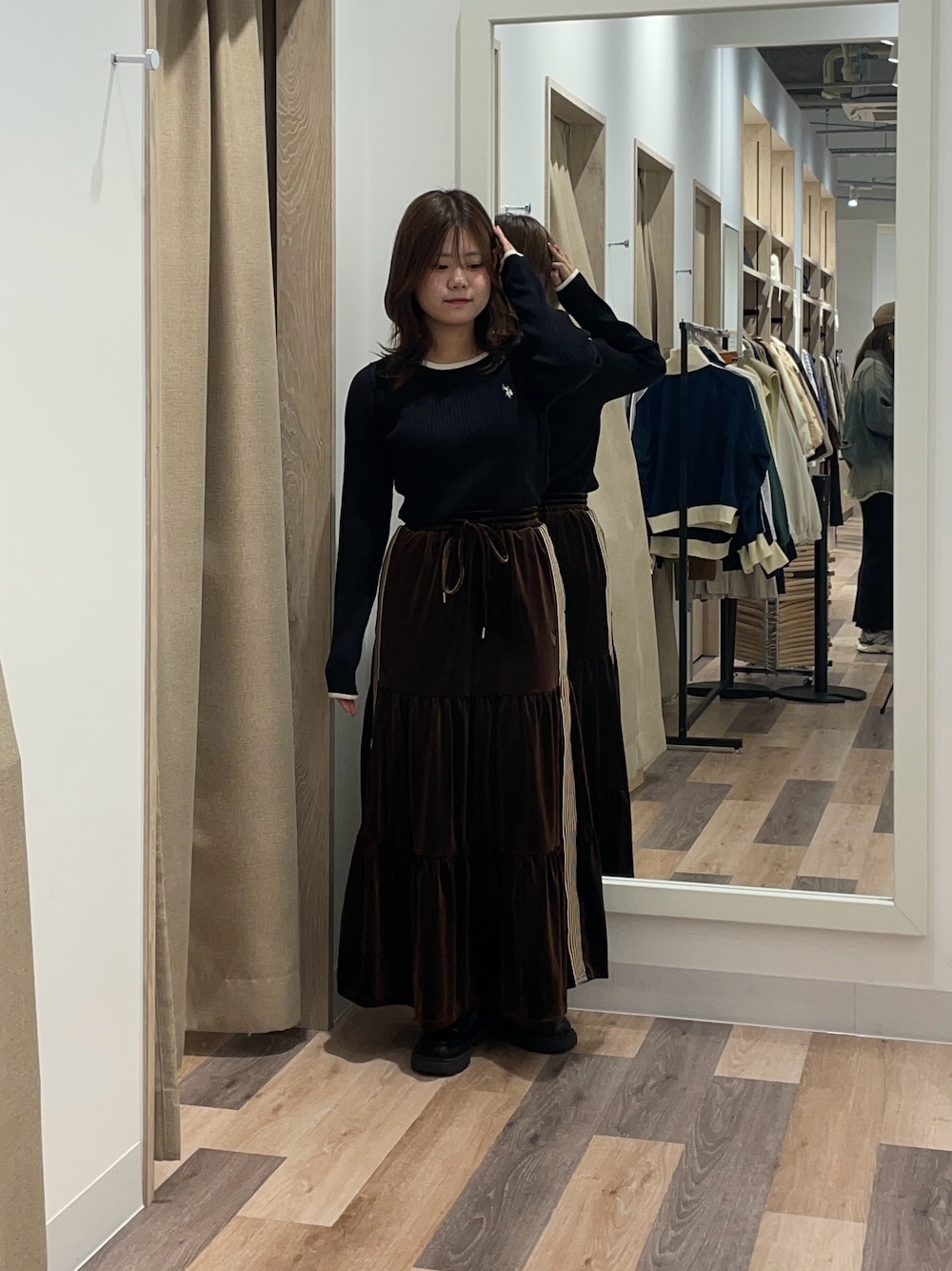 リブニットは骨ストさんにとてもおすすめです! ジャストサイズなのに生地が伸びてくれるから余計に肉感を拾わない盛れるニットです! スカートはベロア素材なので高見えします! 丈感はくるぶしくらいなので低身長さんはPSサイズがおすすめです!