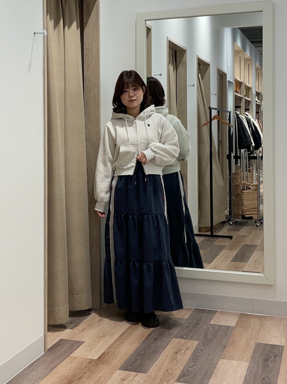 155cm骨スト Instagram→h.m.i.o_05 パーカーは裏起毛なのでこれからの季節にもぴったりです! 短丈ですが袖丈も長めフードも大きめなので骨ストさんに特におすすめです! スカートはくるぶしくらいの丈感なので低身長さんはPSサイズがおすすめです!