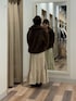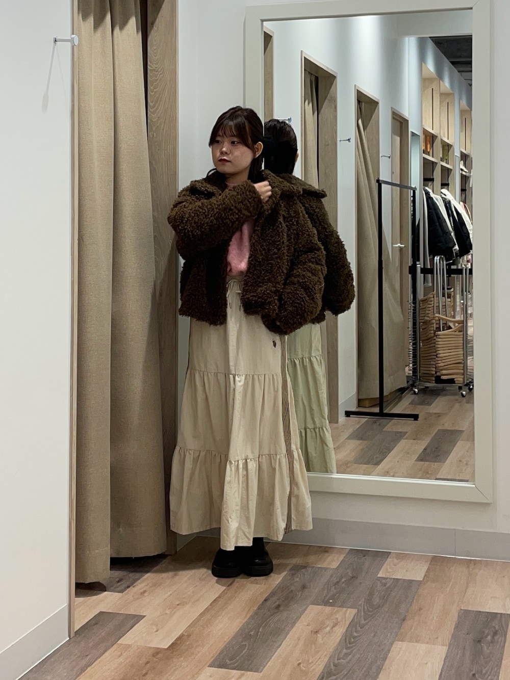155cm 骨スト Instagram→h.m.i.o_05 ファージャケットはSサイズ着用で腰くらいまでの丈感です!(Mサイズはおしりが隠れるくらいの丈感なので着たい雰囲気に合わせて選ぶのがおすすめです!) スカートはくるぶしくらいの丈感なので低身長さんはPSサイズがおすすめです!