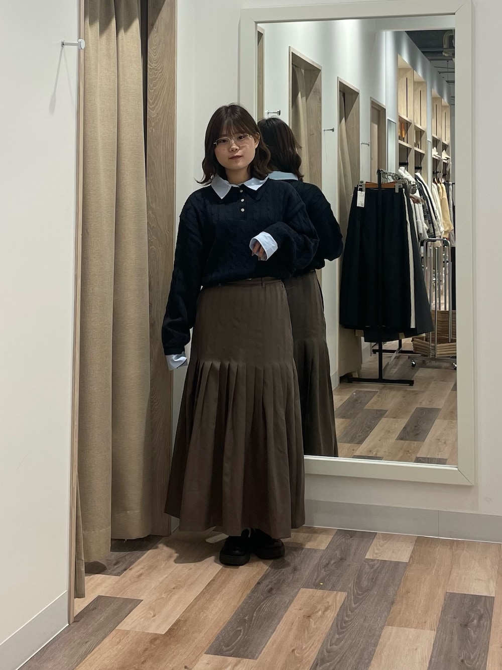 トップスはレイヤード風なので襟、袖にシャツ素材が付いているアイテムになっています! 着膨れせずにレイヤードスタイルが楽しめるので骨ストさんに特におすすめです!