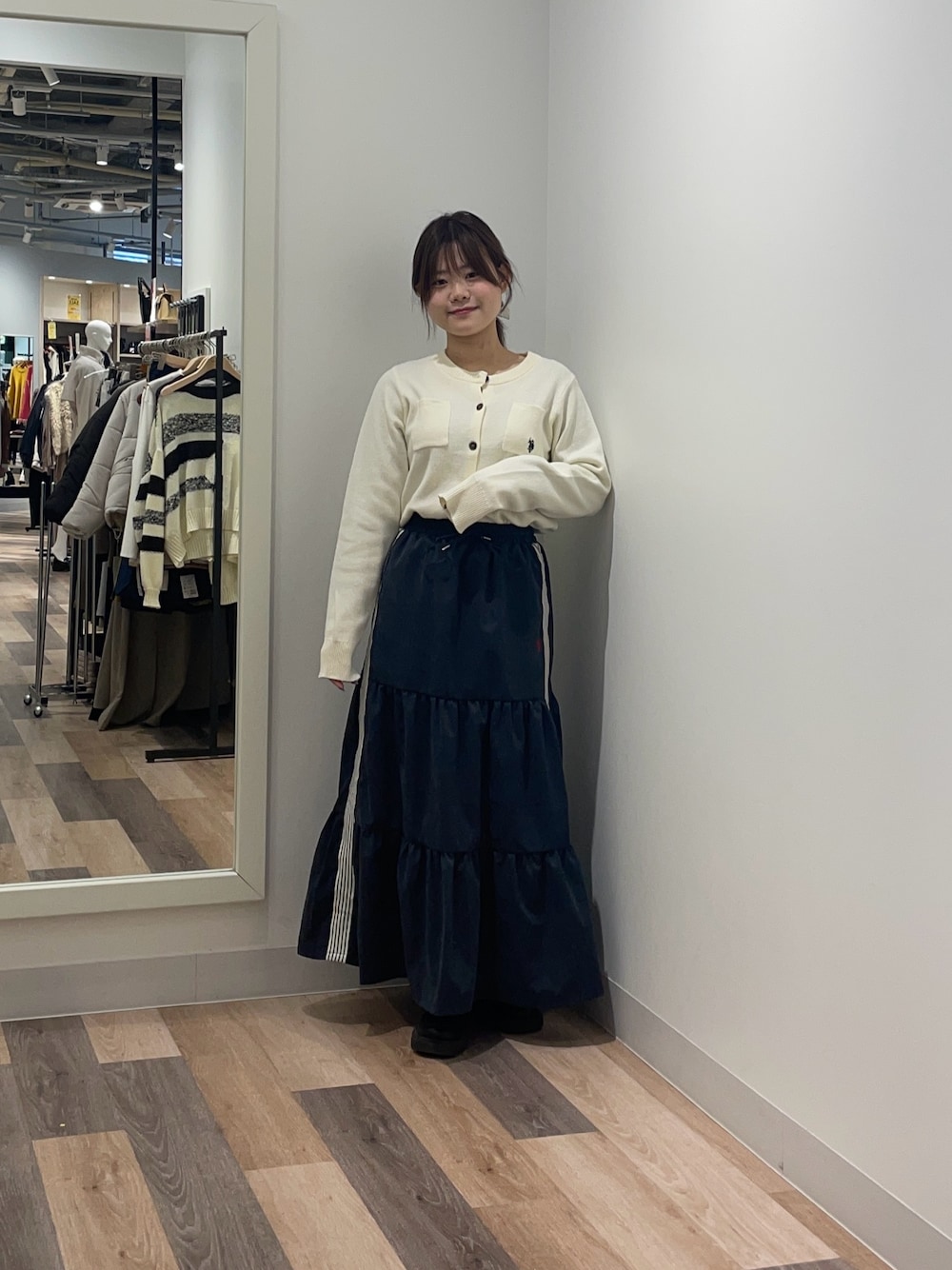 カーディガンは淡いカラーですとインナーが若干透けるので注意です! インスタイルもアウトスタイルにも使える丈感です! スカートはくるぶしくらいの丈感なので低身長さんはPsサイズがおすすめです!
