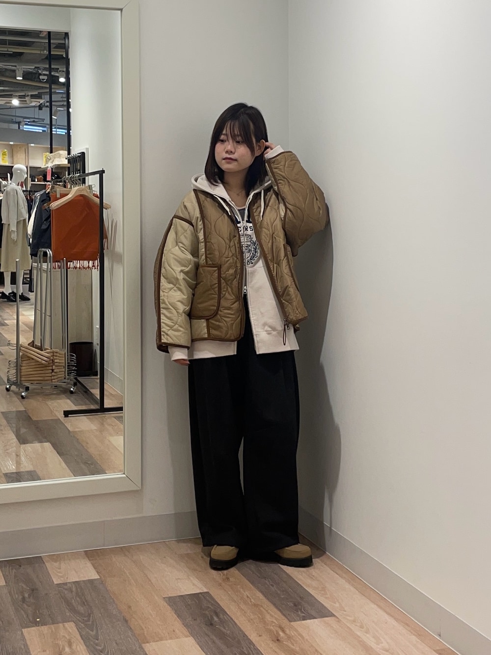 アウターは中綿入りですが薄めで軽いので骨ストさんでも着膨れせずに着ることができます! パーカー、パンツはユニセックスなので全体的にゆったり着ることができます! パンツはMサイズ着用で厚底を履いて床ぎりぎりなので低身長さんはSサイズがおすすめです!