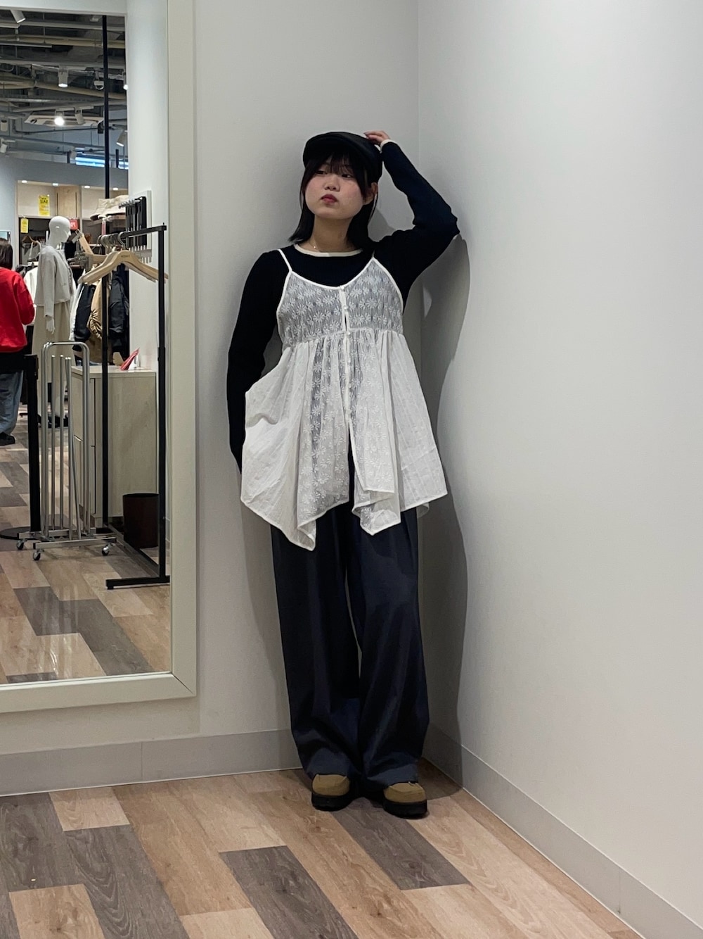 リブニットは骨ストさんでも着やすい少しゆとりがあるトップスです! キャミチュニックは前後2wayで肩紐調節ができるので大きめサイズのトップスの中に仕込むこともできます! スラックスはユニセックスのMサイズ着用で厚底を履いて床ギリギリの丈感です!低身長さんはSサイズがおすすめです!