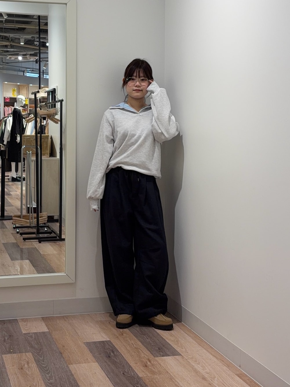 トップスは襟にシャツ素材がドッキングされたアイテムです! パンツはユニセックスのMサイズなのでゆるっと履くことができます