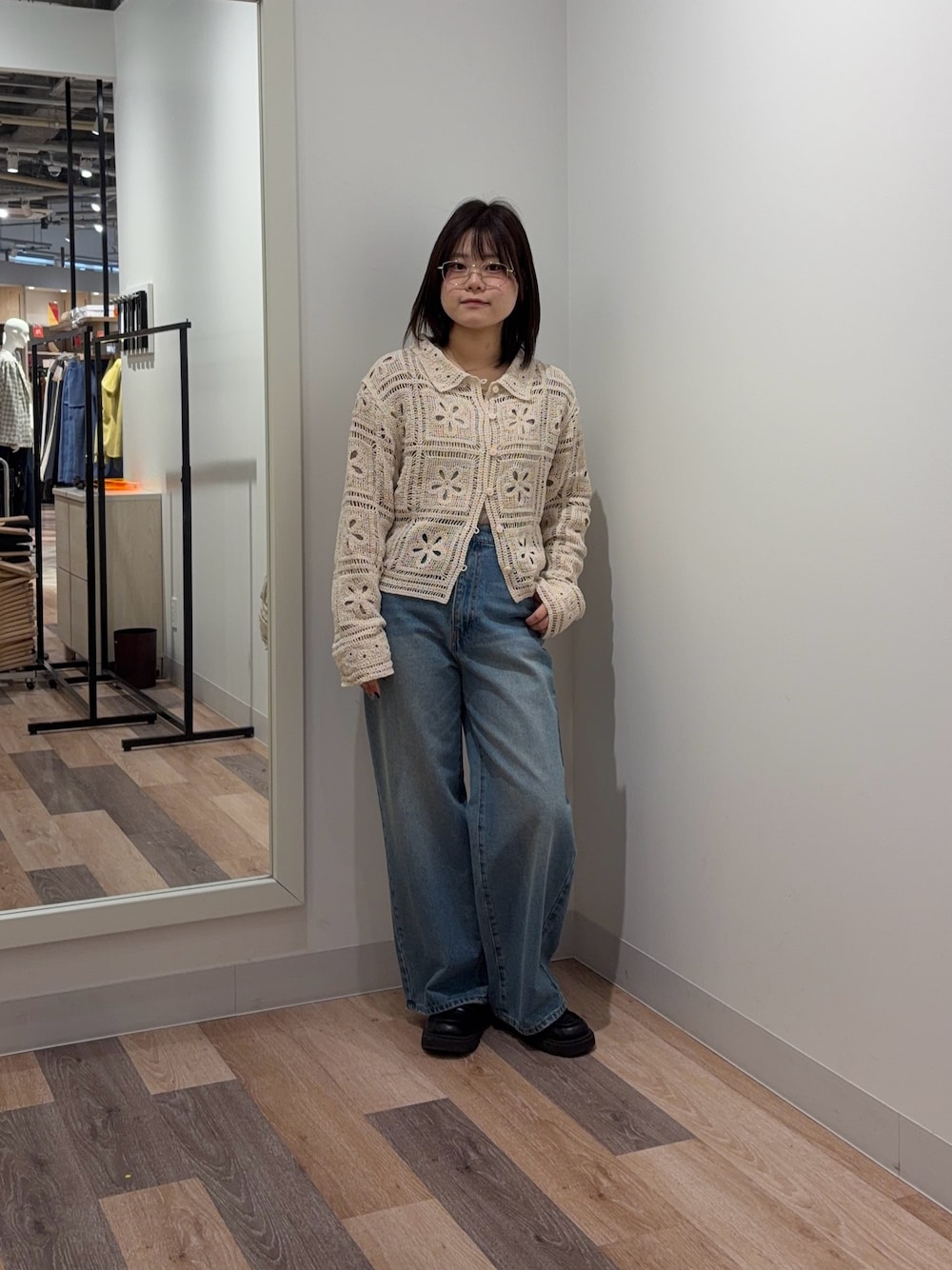 クロシェカーディガンは袖丈が長めなので腕が長く見えます!(お肌が弱めな方には少しチクチクするかもしれないのでシアーインナーなどを仕込むのがおすすめです!) デニムは丈感は長めなので普段はいているサイズのワンサイズ下がおすすめです!