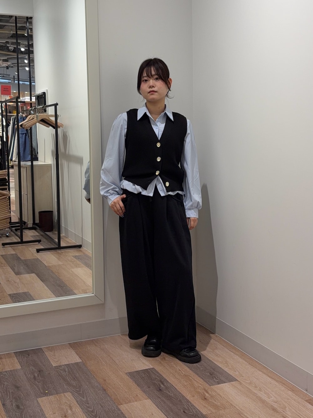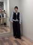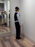 シャツは短丈で裾がバルーンデザインになっています!アウトスタイルがおすすめです! ベストは厚みがあまりなく、深めのVネックなので骨ストさんでも着膨れしにくいです! パンツはFサイズ着用で靴にかかるくらいの丈感です!