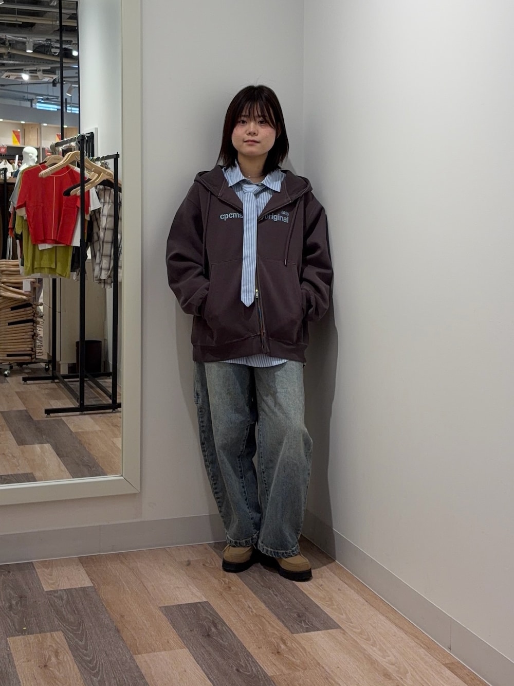 パーカーはユニセックスのMサイズ着用でゆるっと着ることができます! シャツはインスタイルでもアウトスタイルでも使える丈感です! デニムはSサイズ着用で靴にかかるかかからないかくらいの丈感なのでゆるっと履きたい方はワンサイズあげるのもおすすめです!