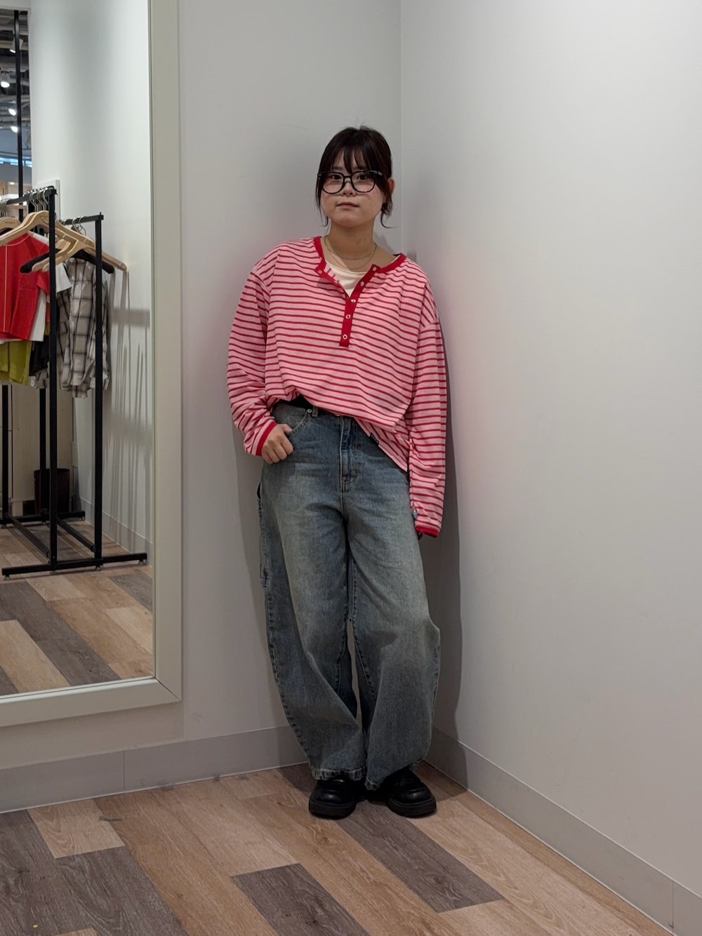 トップスはシアートップスとタンクトップがセットになっているアイテムです! デニムはSサイズ着用で靴にかかるかかからないくらいの丈感なのでゆるっと履きたい方はワンサイズあげるのもおすすめです!