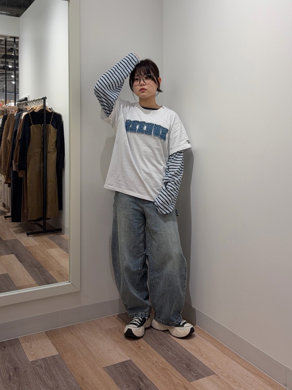 シアーロンTはゆるっと大きめサイズです! 透け感がカラーよって異なります デニムはSサイズ着用で靴にかかるかかからないかくらいの丈感なのでゆるっと履きたい方はワンサイズ上がおすすめです!