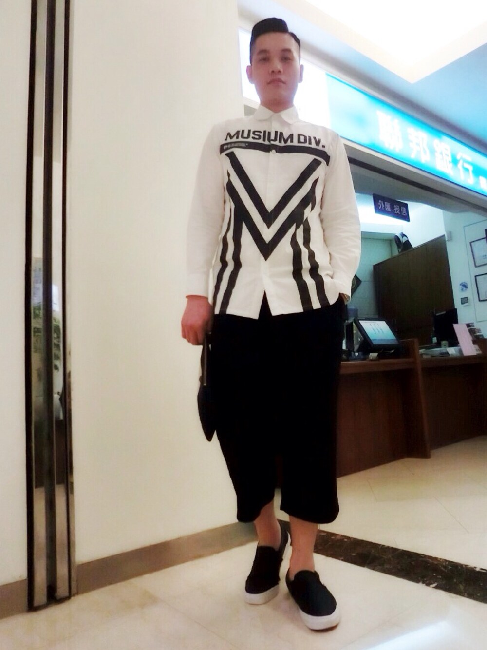 黑白百搭,上下身重點都是OVERSIZE,長版襯衫加上八分寬褲管老爺褲!看似危險搭配,好在本人還算高,比例就沒被吃掉,上衣簡單的幾何線條微微帶出一些些未來感,希望有搭上微風銀河之夜的主題😂✨
