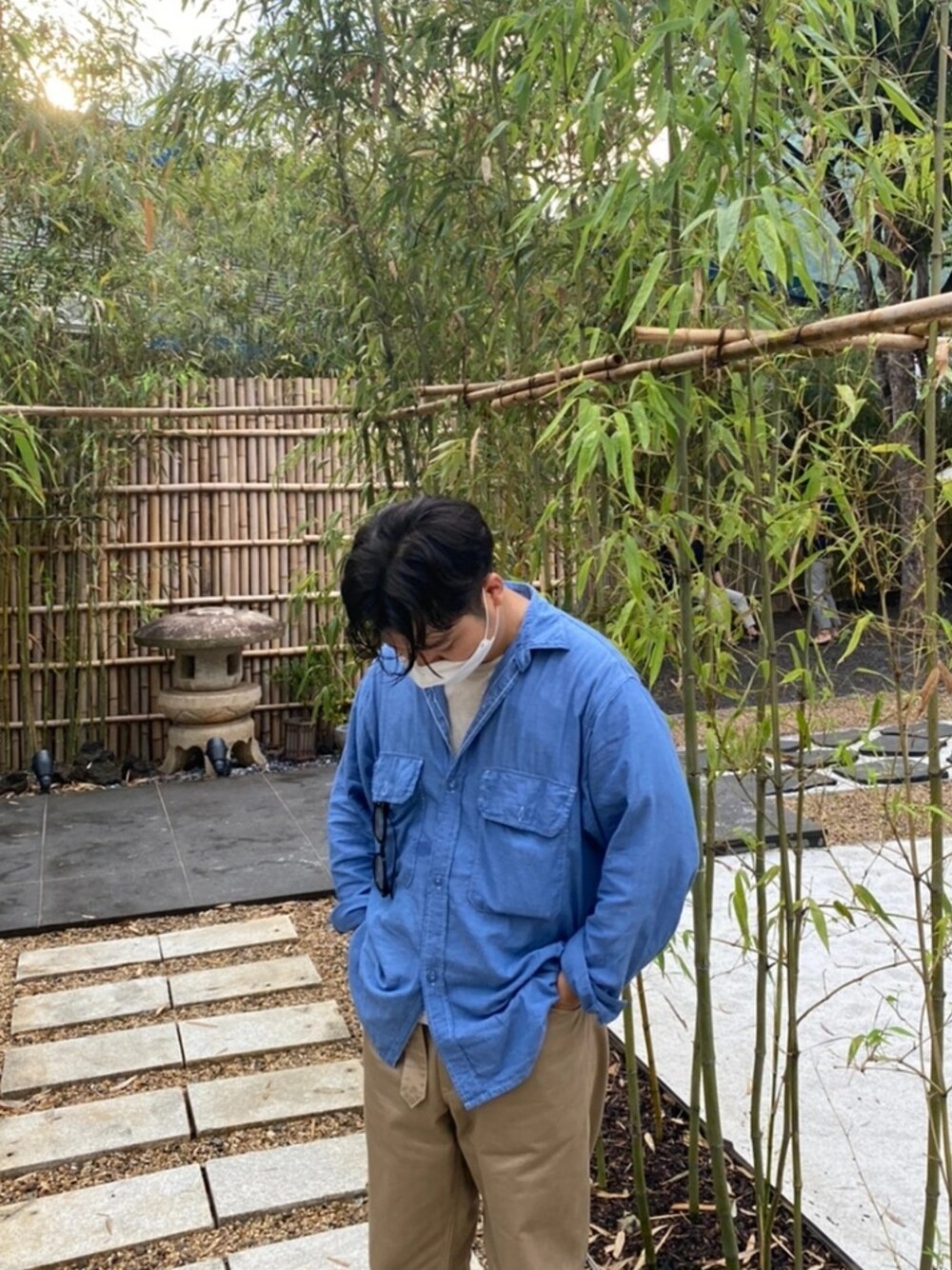 ブルー系のシャツ/ブラウス、ベージュ系のチノパンツを着用したメンズの夏コーディネートの1枚目の写真