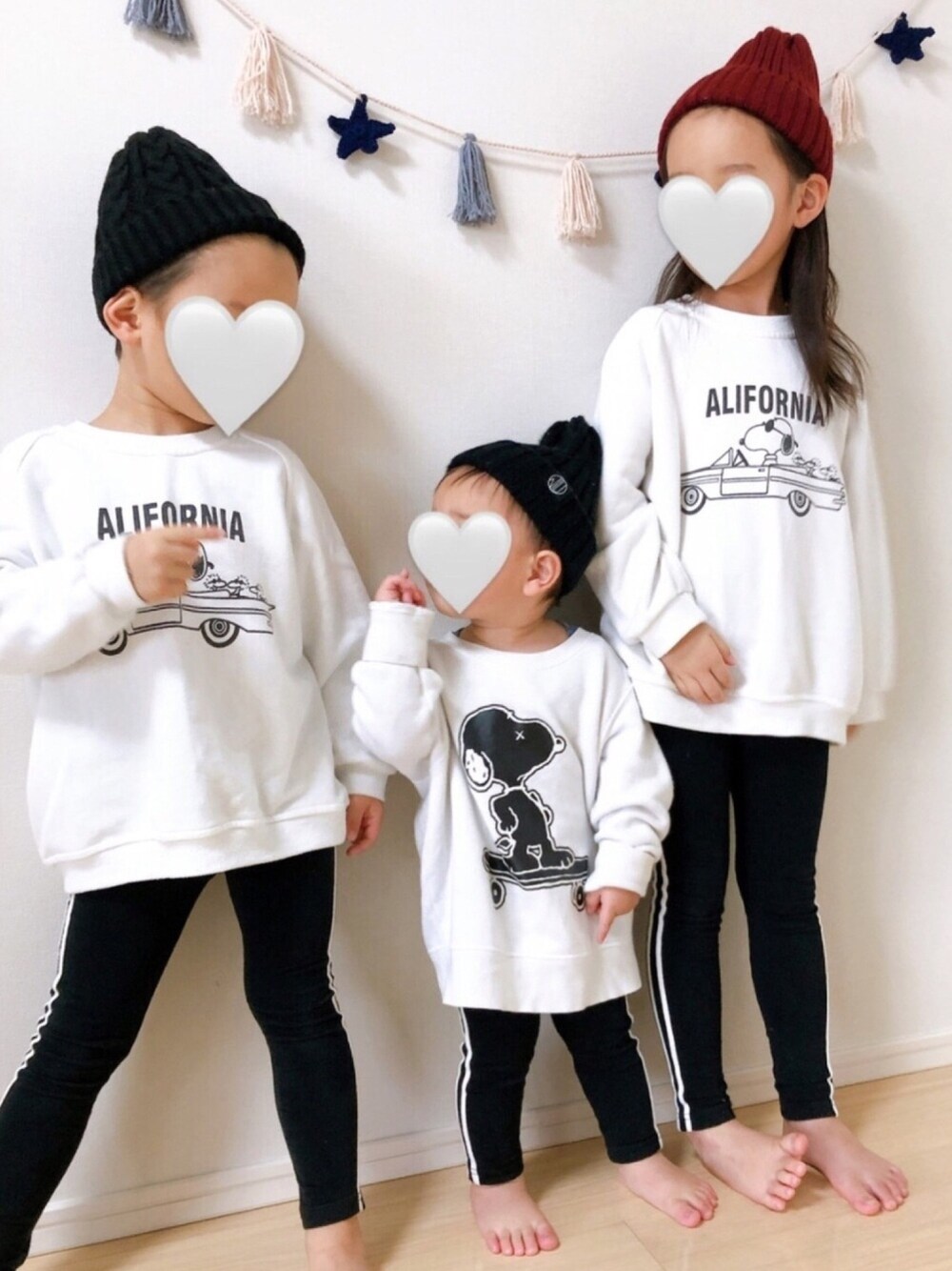 ユニバ行った時のコーデ🖤 ちょうど3人ともスヌーピーのトレーナーとレギンス持ってた✨ 次男は長男のおさがり100cm着てるからちょっとブカブカ😂 普段変顔しかしないお調子者長男です