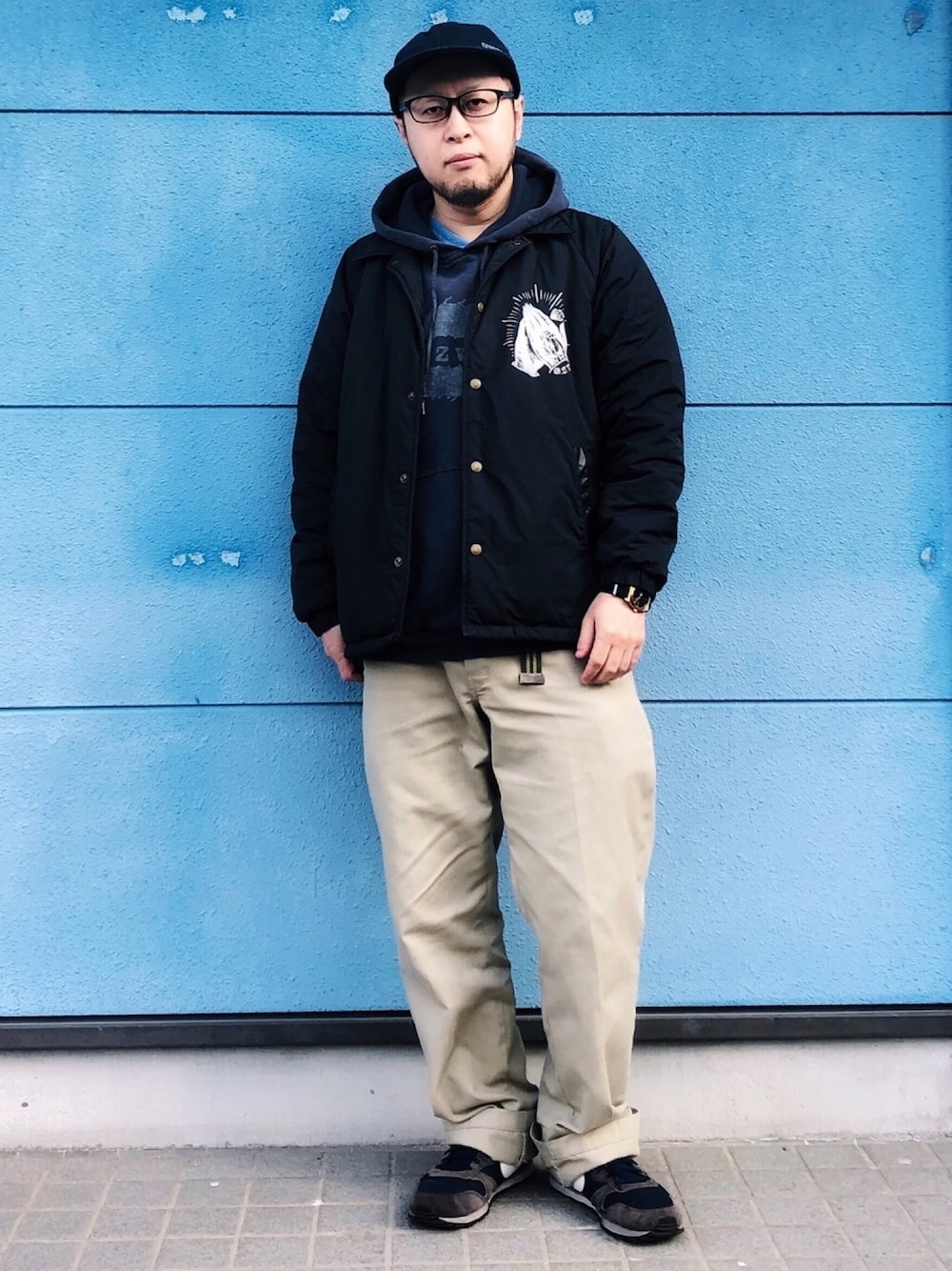 ネイビー寄りの人 ■キャップ: Georgia (古着/懸賞特典らしい) ■メガネ: JINS ■ボアコーチ: GANGSTERVILLE ■パーカー: anvil (ENDZWECK物販) ■時計: NIXON (TIME TELLER) ■ワークパンツ: Dickies (874) ■スニーカー: NIKE (MD RUNNER 2)