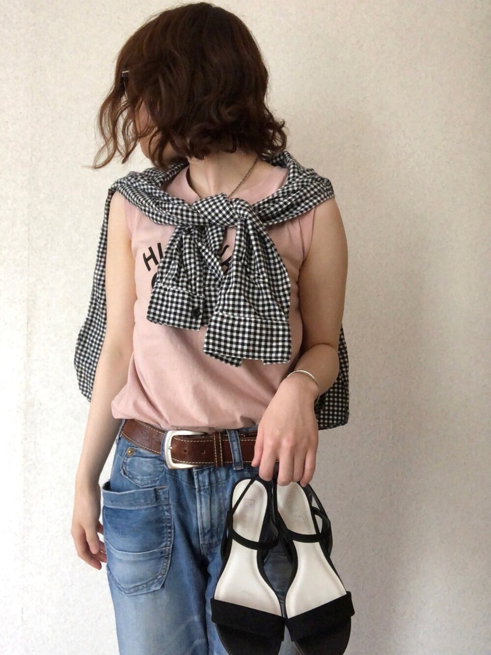 数年前のGUのギンガムチェックシャツに、昔からの愛用デニム、愛用ベルトの着回しの日☘️