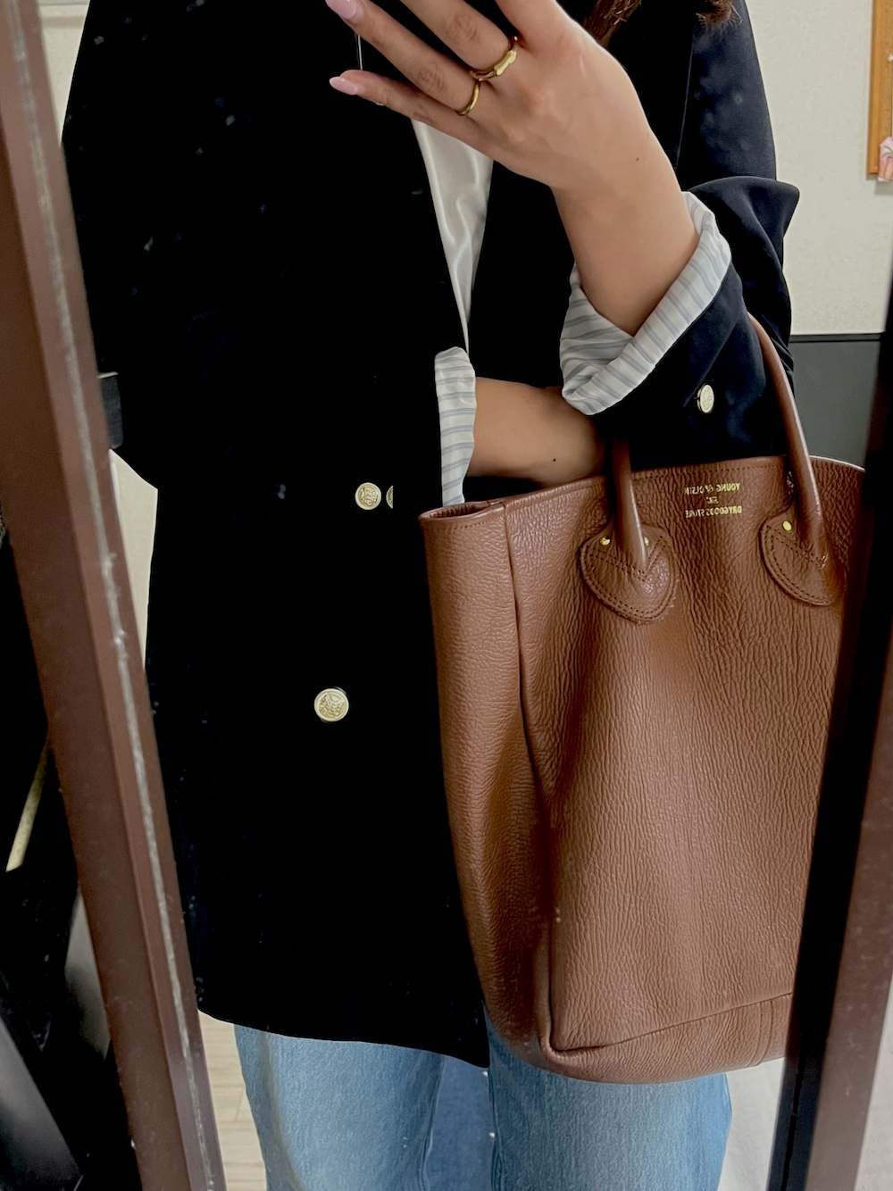 toopoのトートバッグ「YOUNG & OLSEN/ヤングアンドオルセン EMBOSSED LEATHER TOTE M レザートートバッグ/エンボスレザートートスクエア」を使ったコーディネート