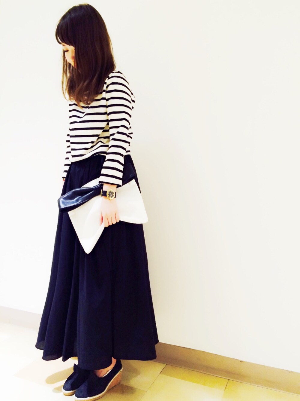 一枚で主役になれちゃうボーダーワンピース! スカートのボリュームが◎ クラッチはリボンなのに甘くなりすぎない スタイリングのポイントになります✡