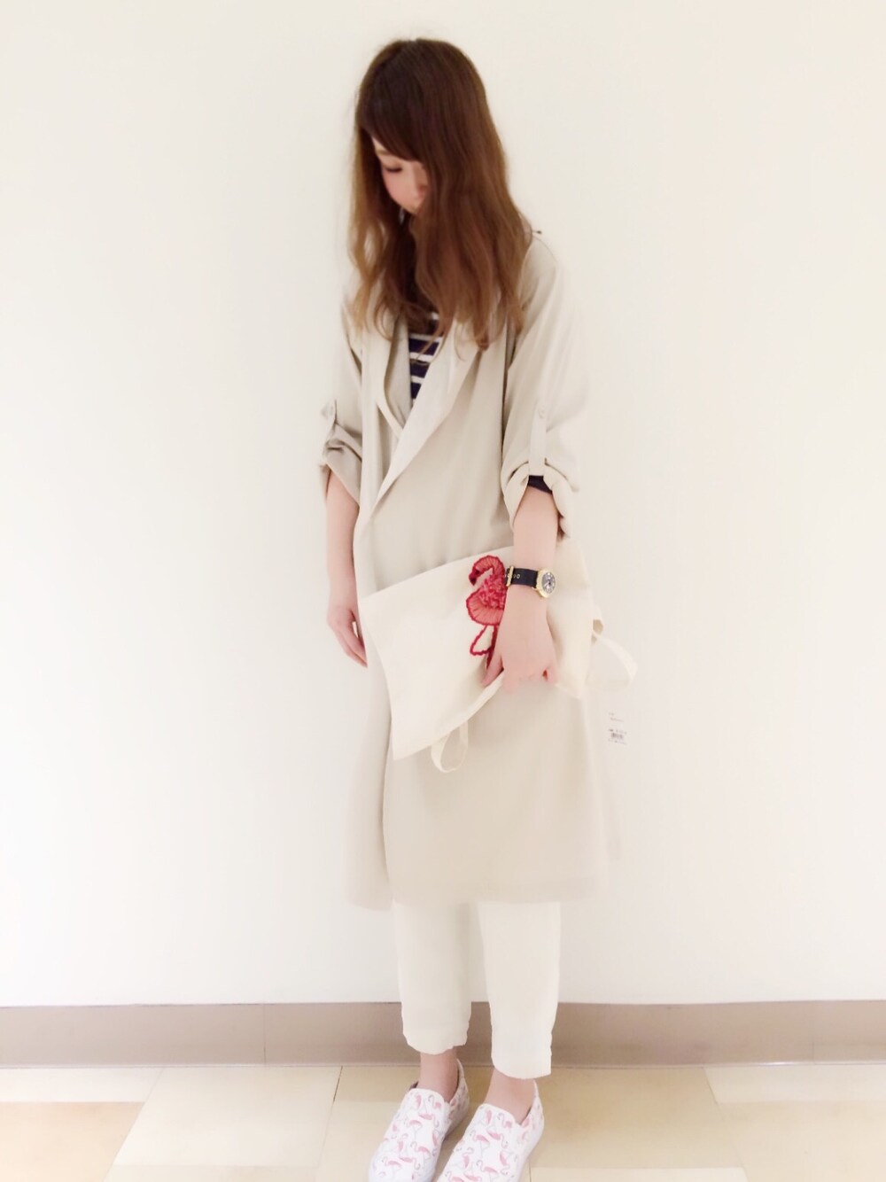 白とベージュのワントーンコーデ コートは薄手でゆったり着やすくオススメ! バックとスニーカーはフラミンゴ柄であわせました☆