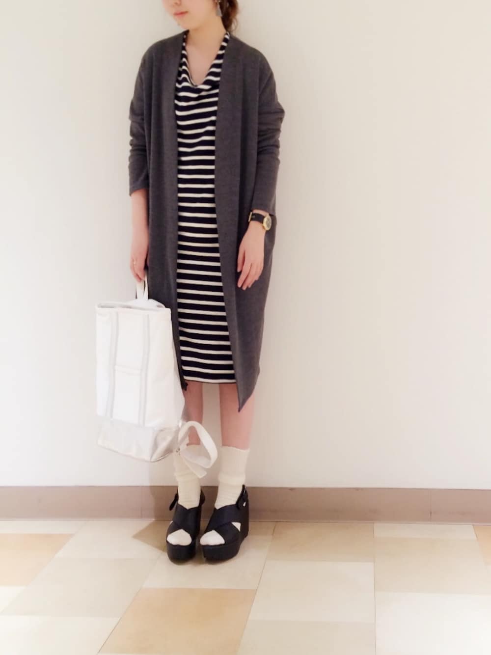 定番のボーダーワンピースにロングカーディガン どちらもシンプルなデザインで着回し力抜群◎ バックパックはキャンバス素材でトートバックのようなデザイン! コーデのポイントになります☆