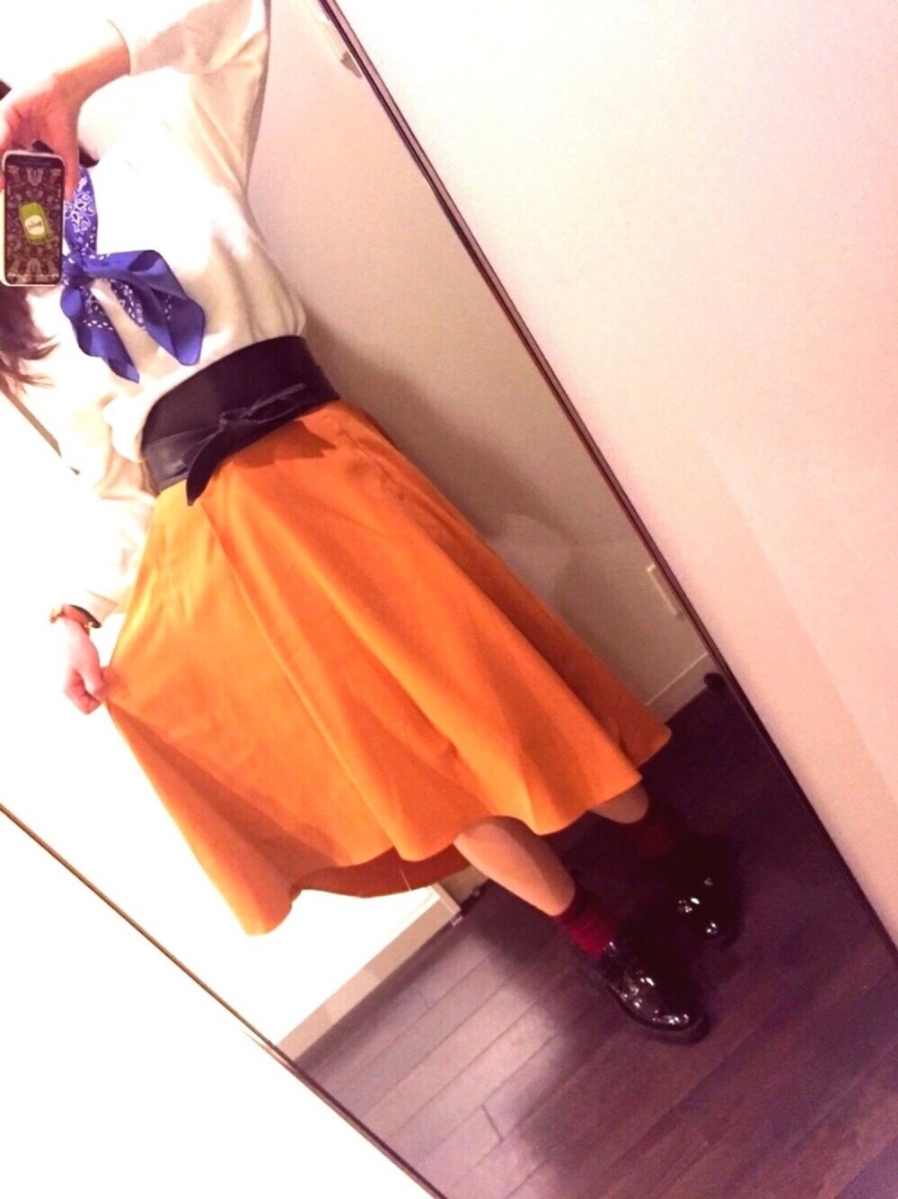 アシンメトリーが優しいスカートと レザーのサッシュベルトが手に入ったので! 写真からはあんまりわからないけど、 横からみたら金魚の尻尾みたいなヒラヒラで めっちゃ可愛いんです(`・ω・´) ポイントはレザーのサッシュベルト ぎゅっとしめたベルトで引き締め効果と 色がハッキリすっきりした気する!!笑 スカーフは赤っぽいのにすればよかったなあと というか、靴下の色に合わせるのが良かったな 反省します!笑 見ていただきありがとうございます。