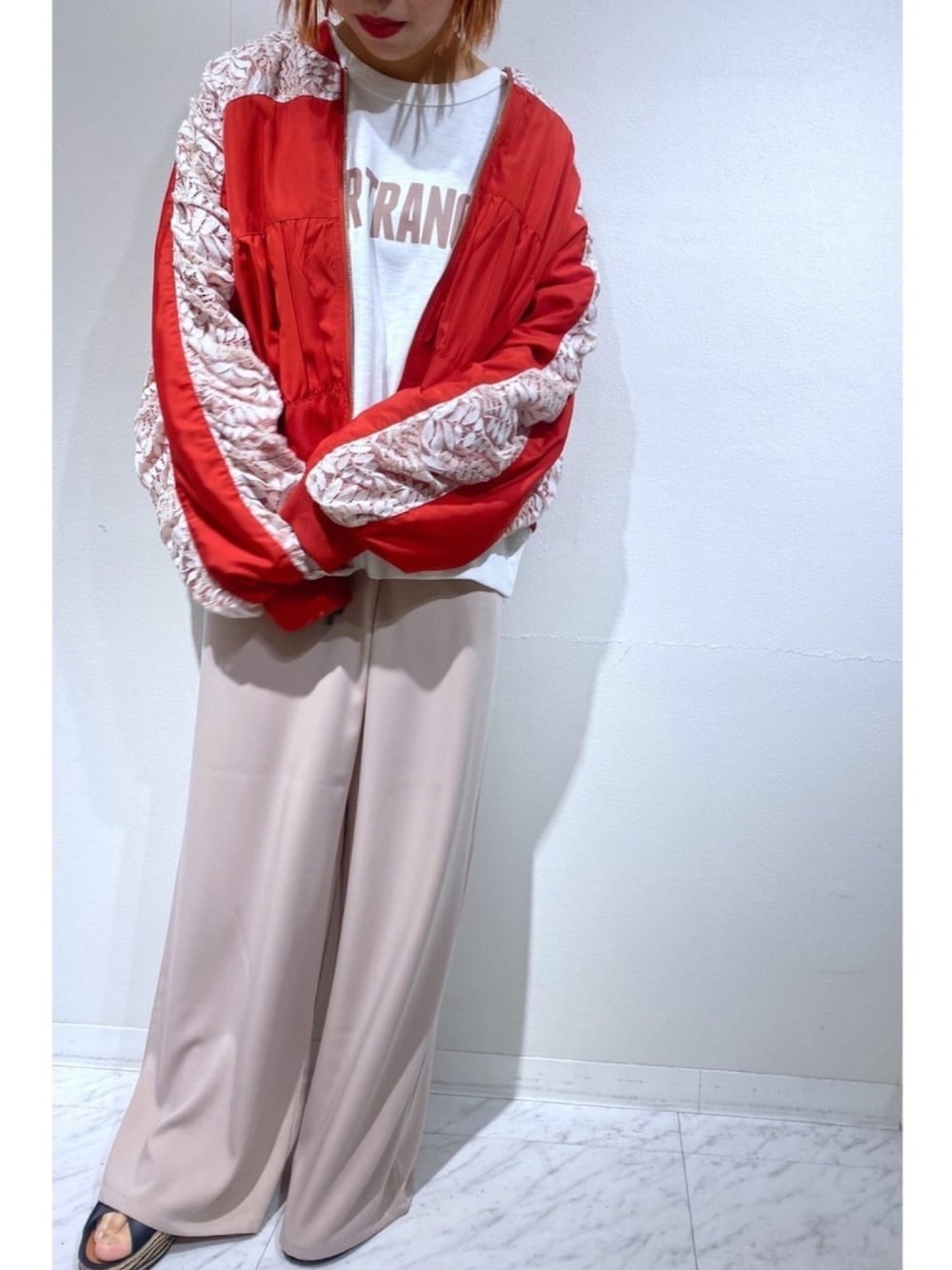 鮮やかなカラーのMA_1ブルゾン。 肩のレースが女性らしく華やかです。 インナーにはロゴTを入れてカジュアルにまとめました。