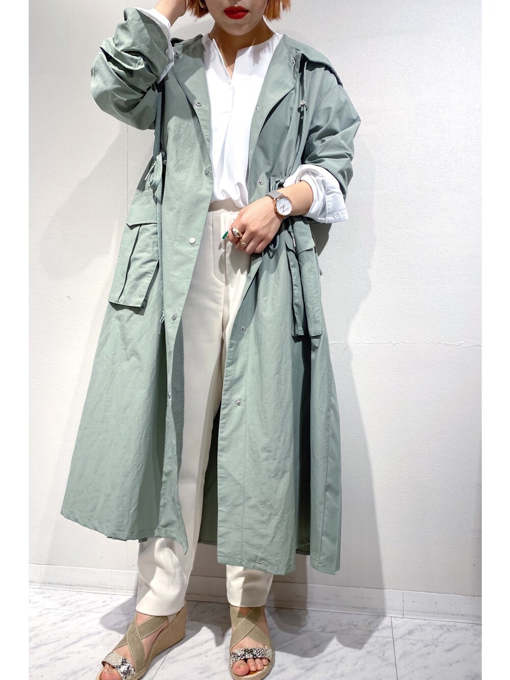 2020注目カラースモーキーなカーキのモッズコートはホワイトのブラウスとホワイトパンツのオールホワイトでカジュアルになり過ぎないスタイリングで。