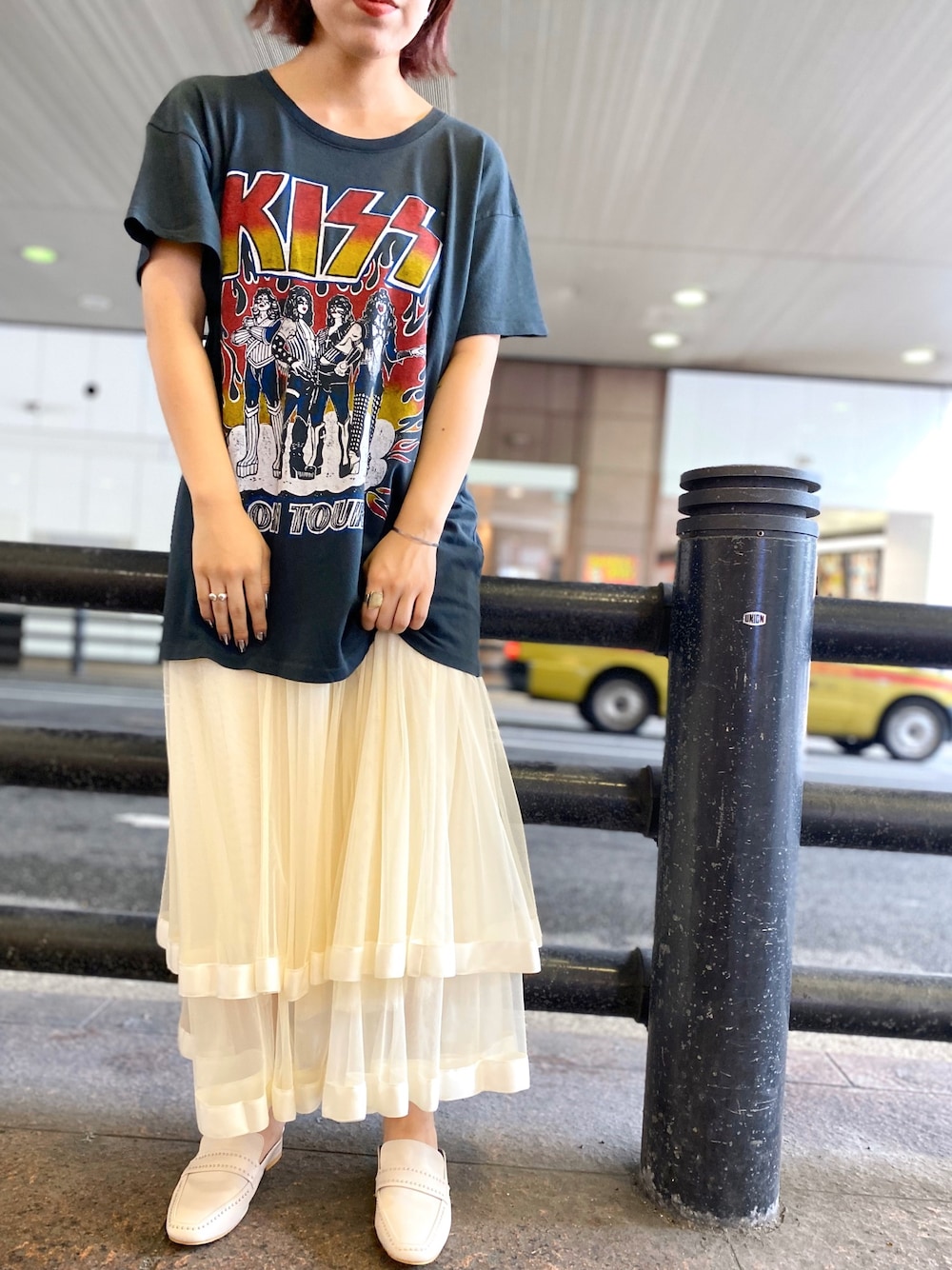 強めインパクトのロックTはフェミニンなスカートと合わせてが鉄板。 Instagram→@hodgepodge_torayachain