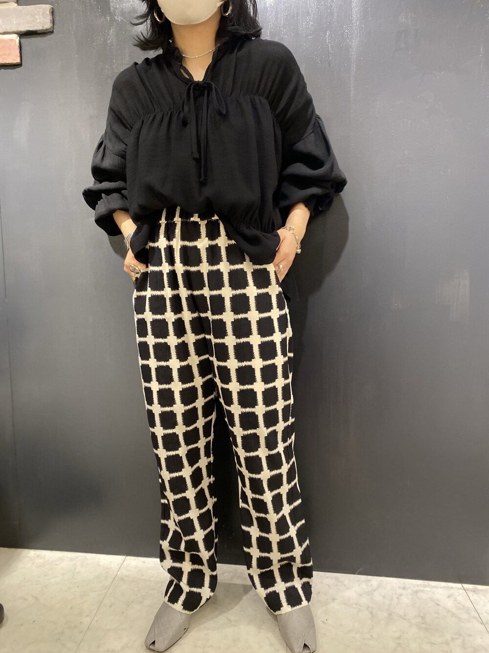 パジャマっぽくなりがちなイージーパンツはブラウスと合わせて大人に🧐 Instagram→@hodgepodge_torayachain