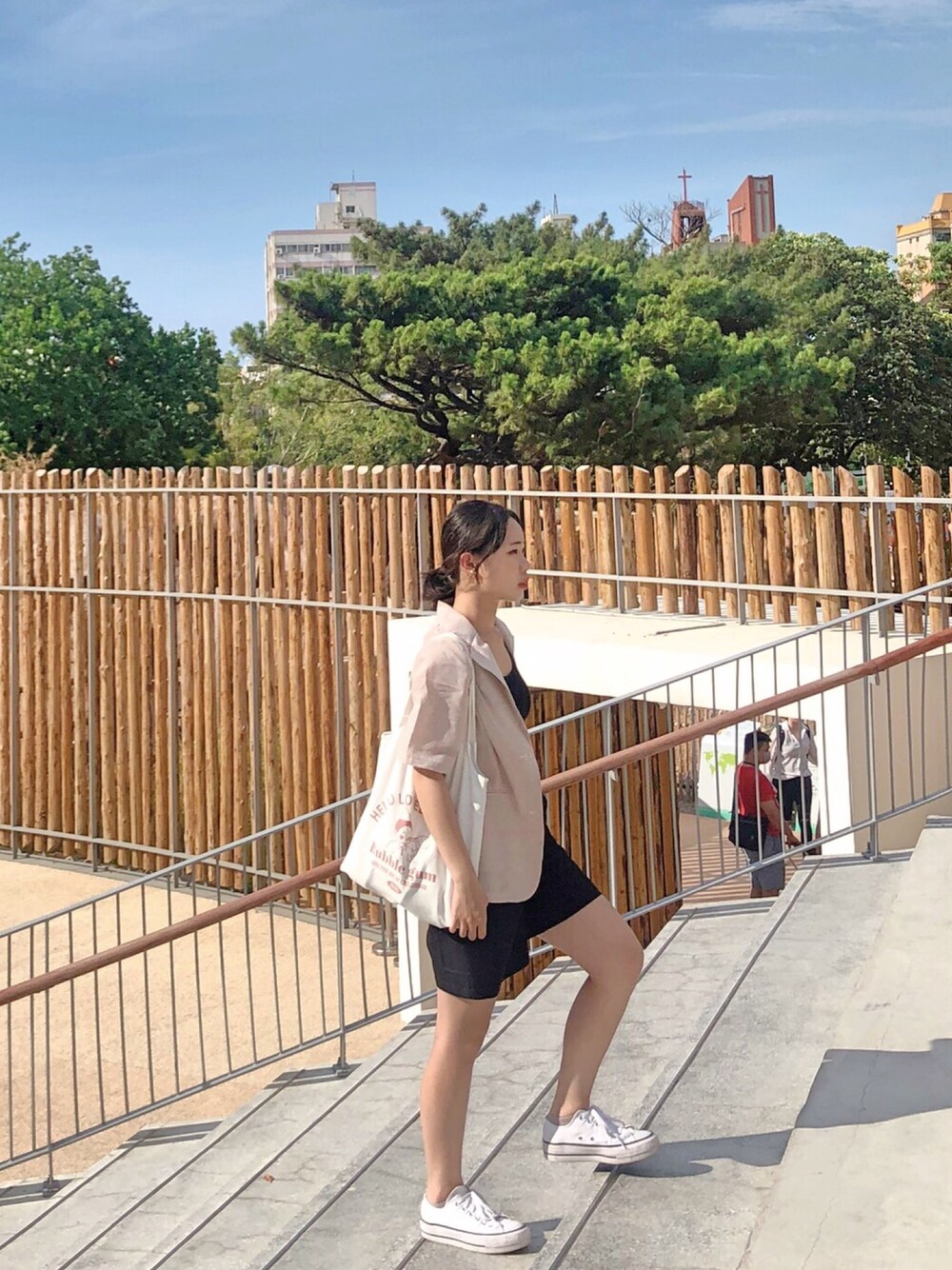 ブラック系のスラックス、ホワイト系のシューズを着用したレディースの夏コーディネートの1枚目の写真