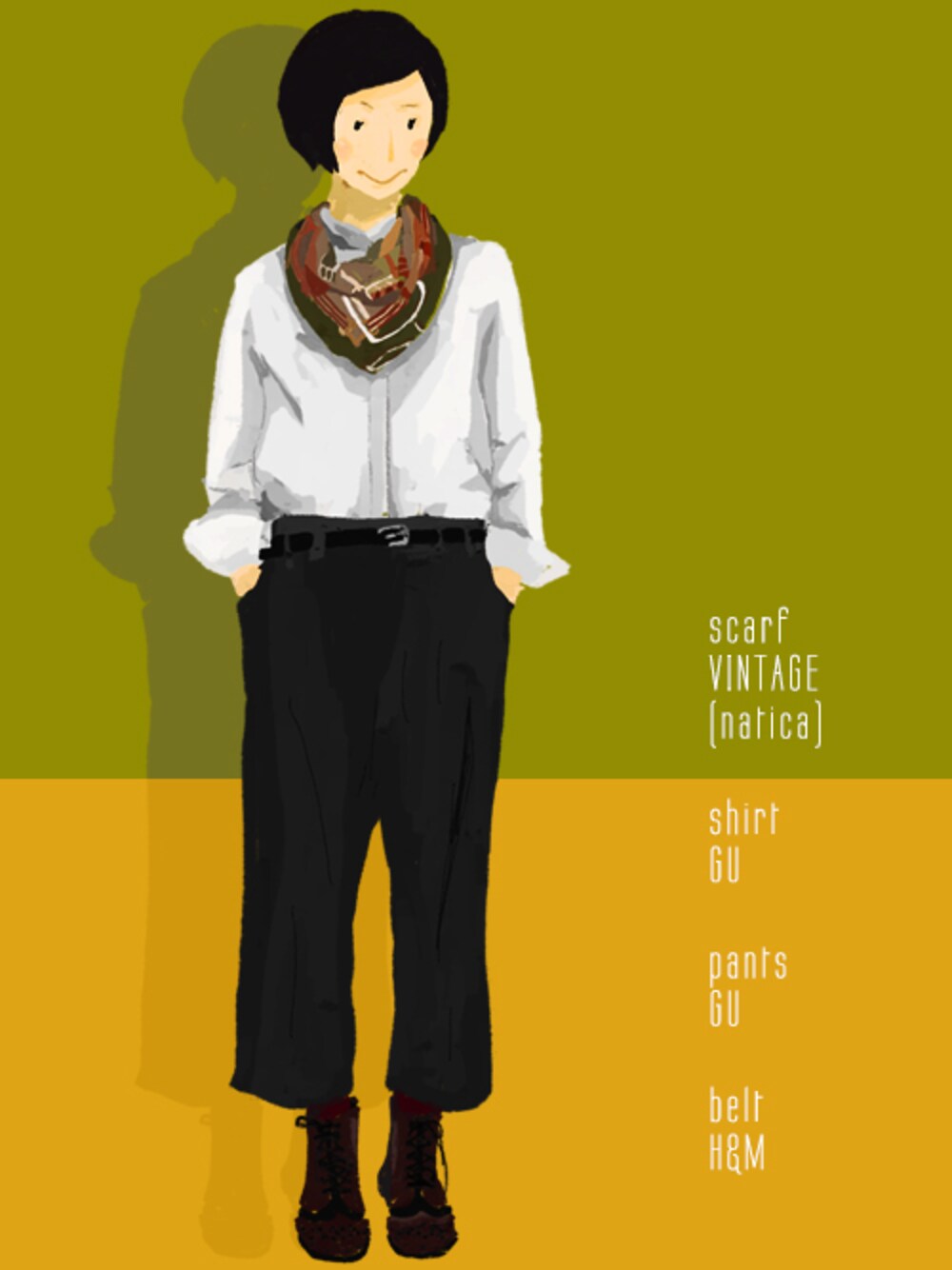 ヴィンテージスカーフ&シンプルコーデ 古着屋さんのスカーフはお手頃価格なのでつい集めてしまう.... 十分雰囲気があるので、シンプルトップスにさっと巻くだけでさまになる(気がする GUのツイードガウチョはラインが綺麗&生地感もしっかりで愛用しています。