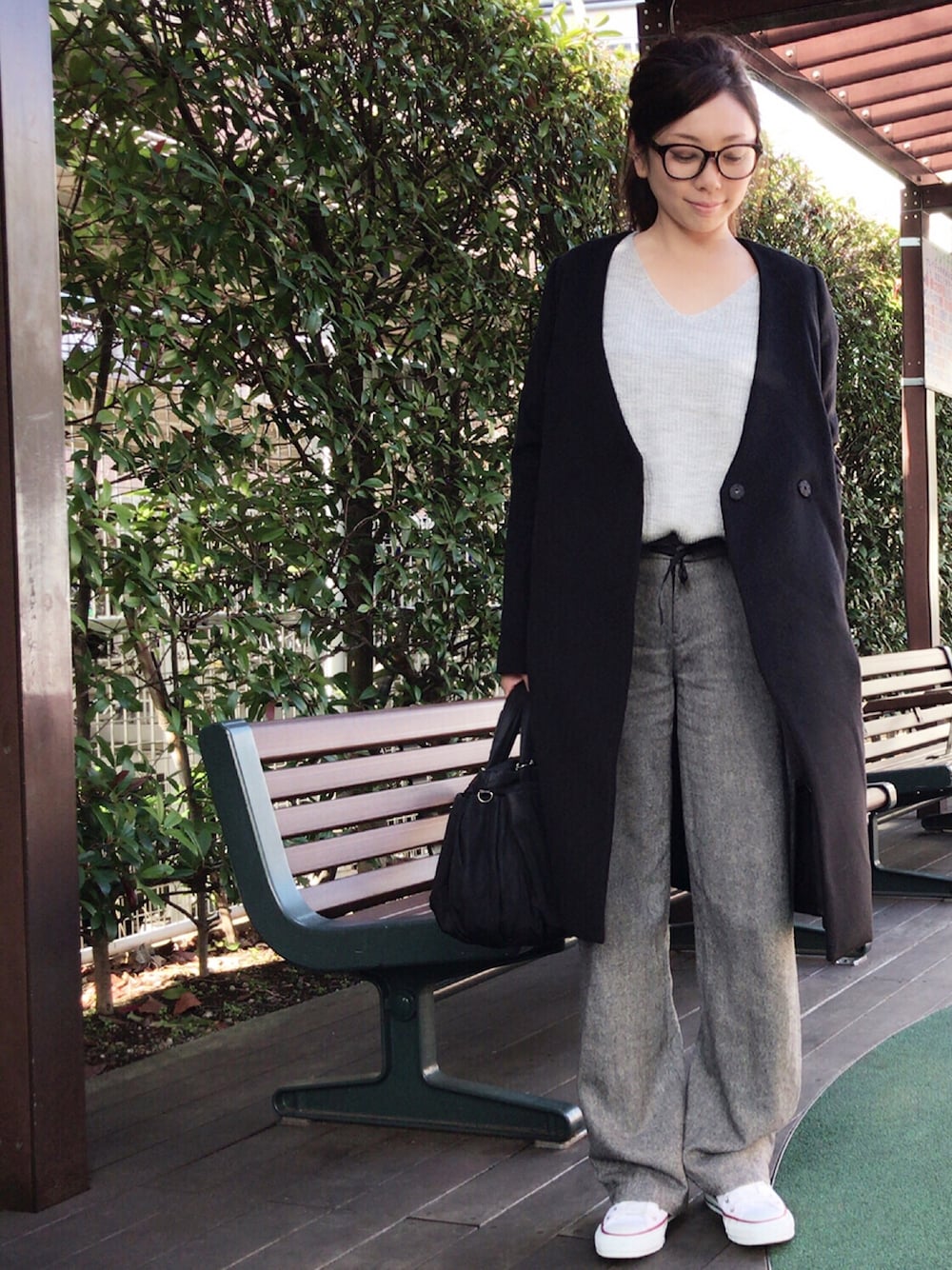 ノーカラーコートってスニーカーでもスリムに見えて好き♡ボリュームのあるモコモコマフラーぐるぐるにも出来るし、ファーティペットつけるとカチッとするし。 それとこのGUニット。 スリットが入ってるから前だけ入れて後ろは隠せるのが優秀です◡̈♥︎