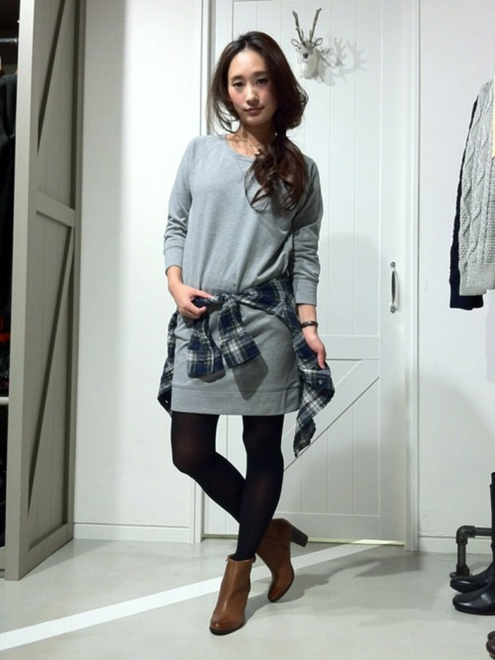 ゆるい裏毛ワンピースには、チェックシャツでメリハリをつけて腰の位置を高くみせるのが、ポイントです。