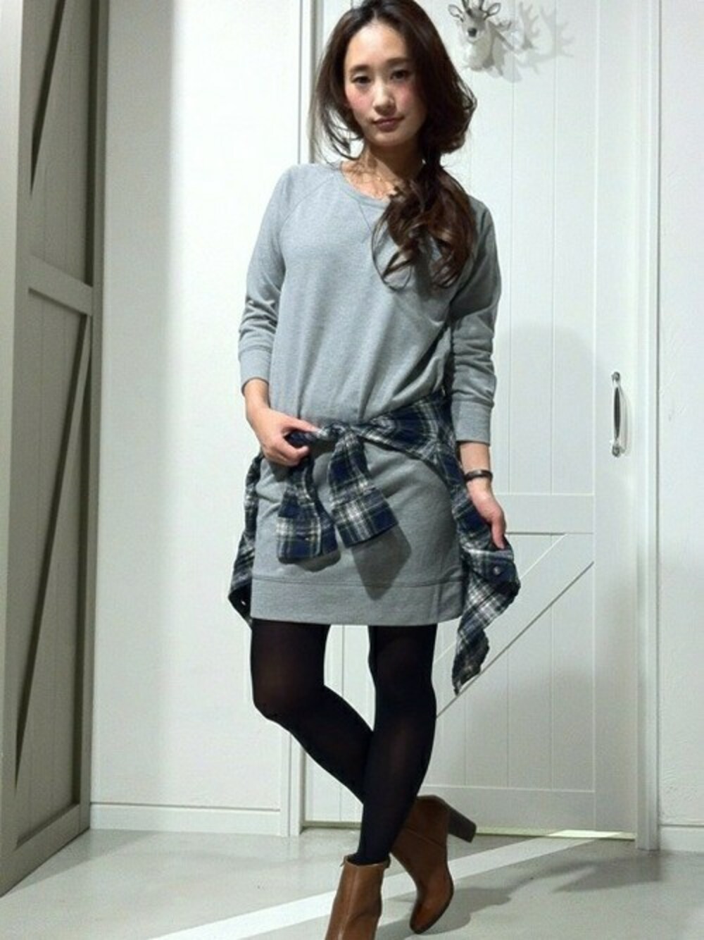 スウェットOPは今季マストアイテムです☆ チェックシャツを巻いて腰の位置を高くみせメリハリがでるように合わせるのがポイントです。