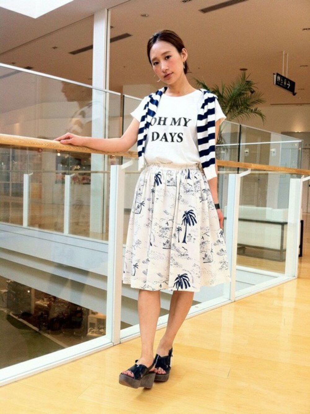 涼しさをもとめて、ブルー系のコーデに偏りがちな今日この頃です。。 気分から涼しく!!が今の私のテーマです。 お袖がロールイアップされたTシャツは腕をすっきり見せてくれます。 大き目のロゴと字体がシックに大人っぽく着ていただけるので、フレアスカート、タイトスカートをインして 着て頂くのが可愛いかな♪と思います。 http://blog.at-scelta.com/myself_l-nishinomiya/coordinate/