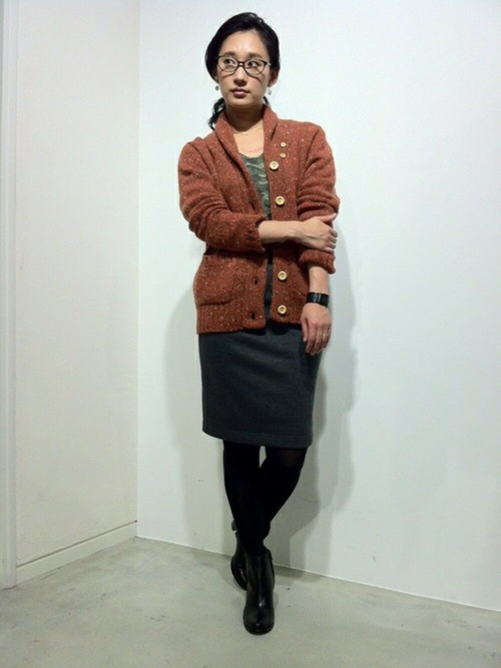ショールカラーのメンズライクニットにはタイトスカートを合わせて女性らしさを出します!