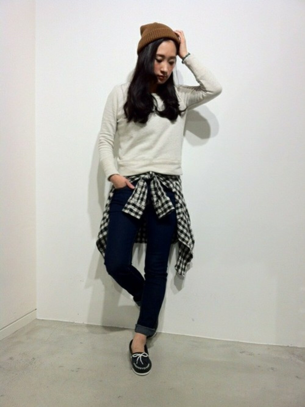 ギンガムチェックはトップスのインナーにレイヤードして、ウエストに巻いてもOK!